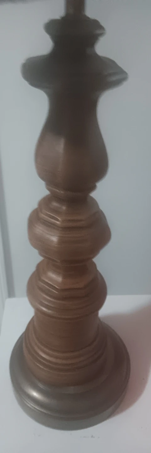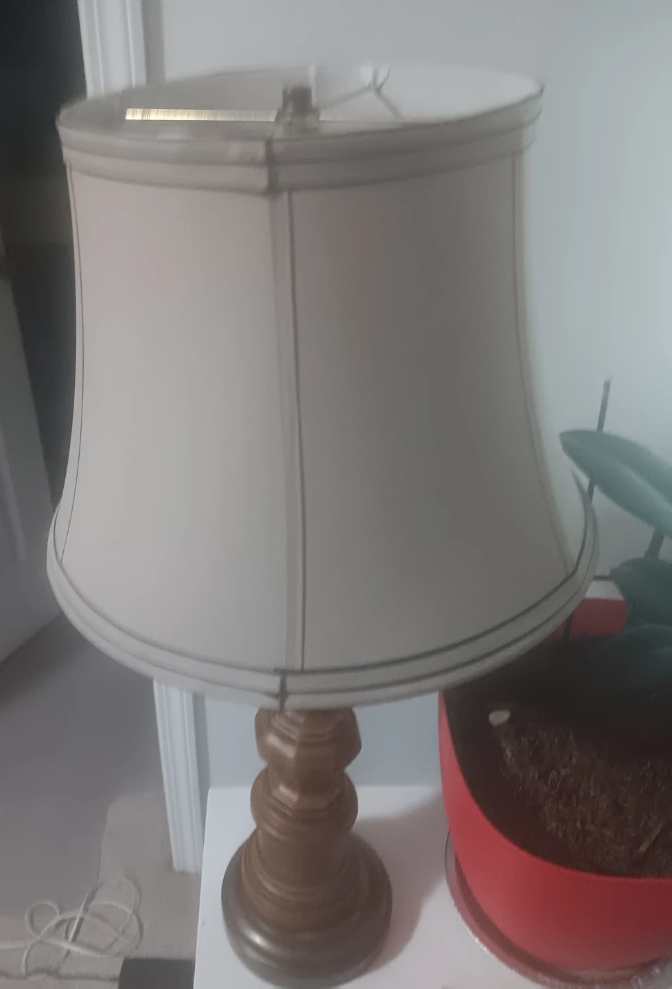 A nice wooden table lamp with a cream-coloured fabric shade. It's a classic design that'll add some warmth to any room. The lamp has a turned wood base and column. It's ready for your bedside table or living room.