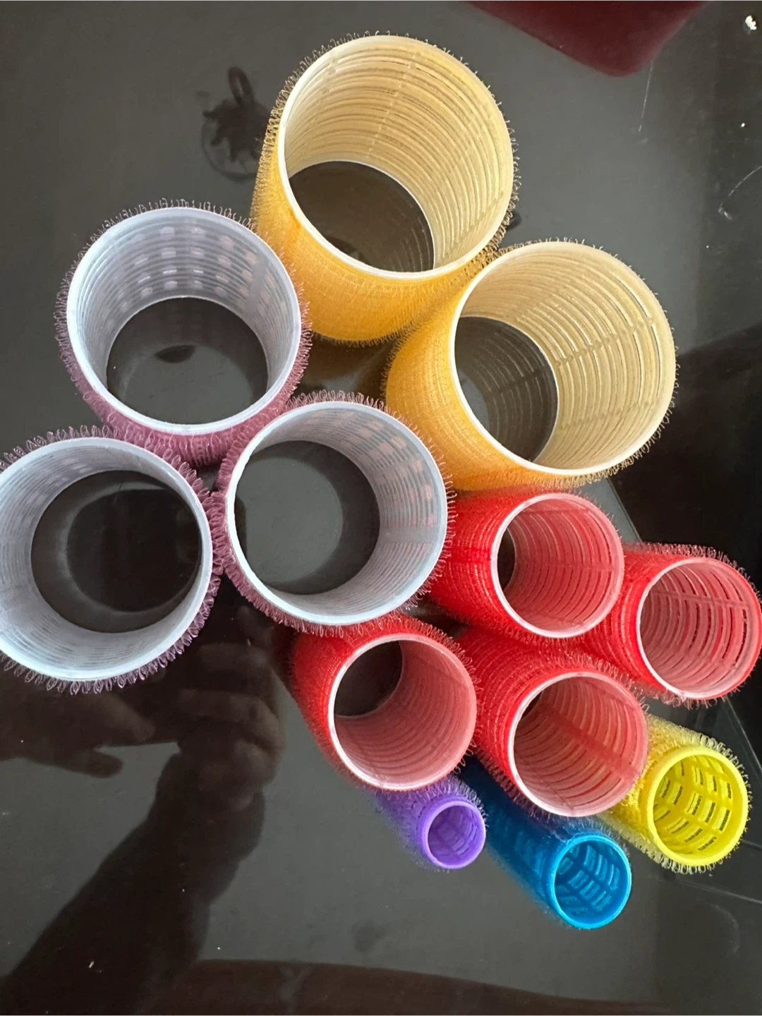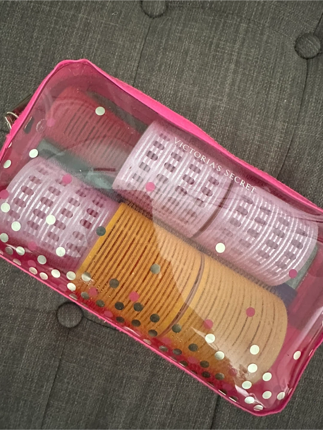 This set includes a variety of velour hair rollers in different sizes and colors. They come in a clear pink Victoria's Secret cosmetic bag with gold polka dots. Get bouncy curls with these rollers!
