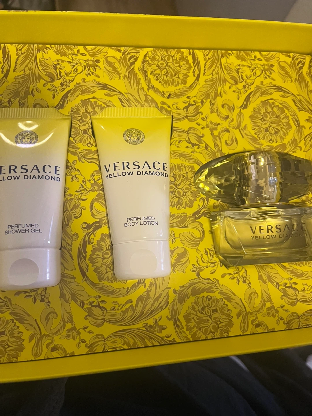 This is a Versace Yellow Diamond fragrance set. It includes perfumed shower gel and perfumed body lotion. Also included is a bottle of Versace Yellow Diamond Eau de Toilette.
