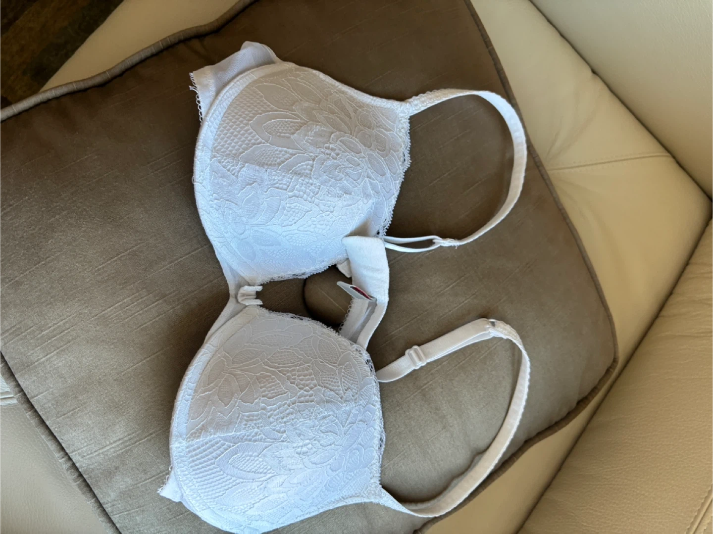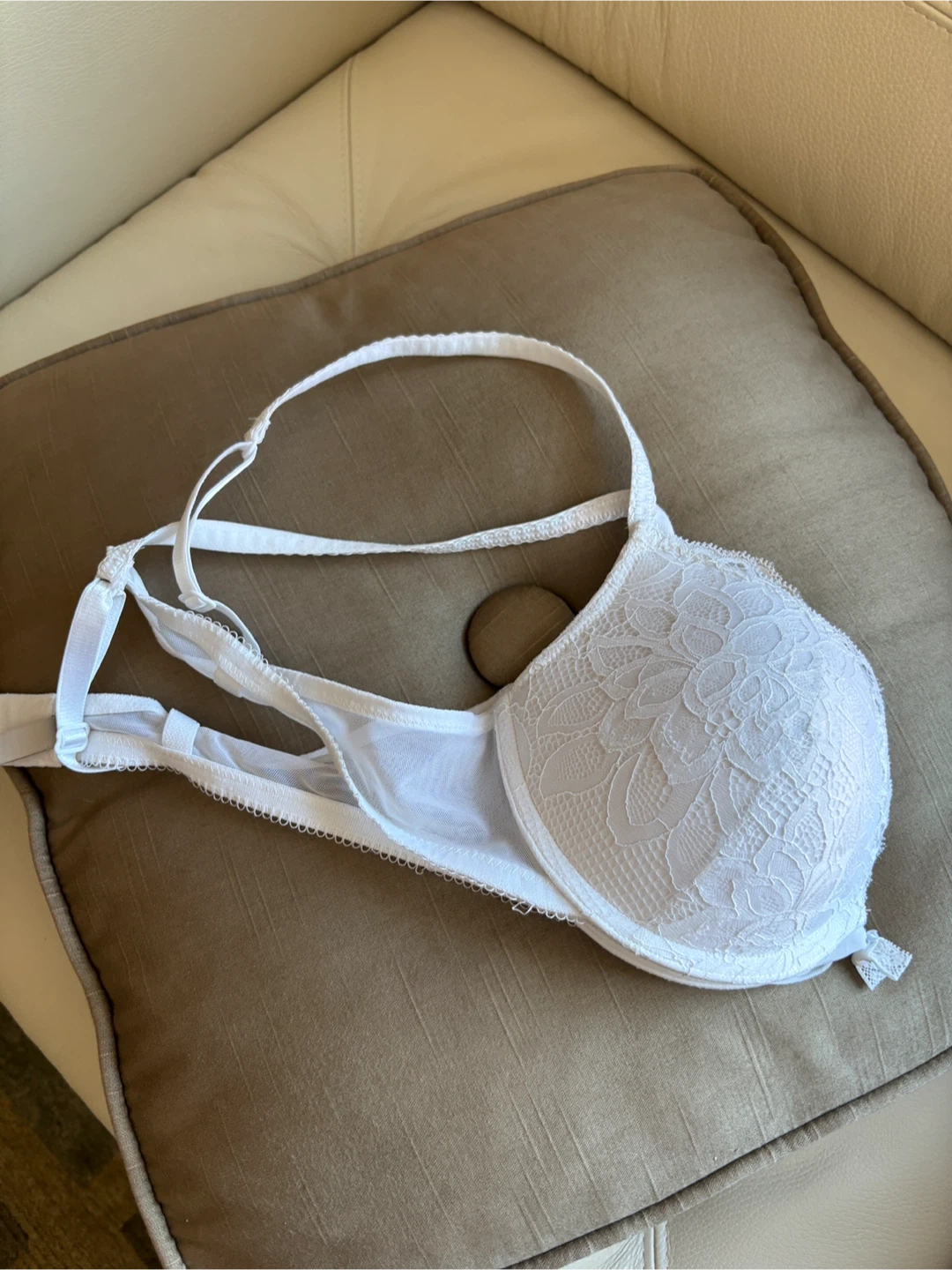 Triumph white push-up underwire bra with delicate lace detailing. Adjustable straps for a custom fit. It's a comfortable option for everyday wear. Used but still lots of life in it . Size is about 34B.
