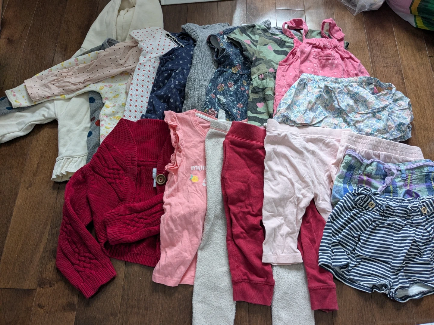 A collection of baby girl's clothing including tops, a cardigan, and bottoms. Sizes range from 18-24 months and 2Y.