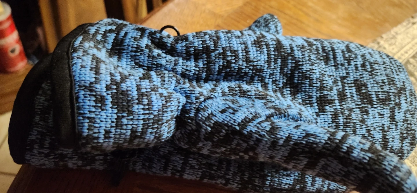 Warm knit gloves in a blue and black marled pattern. These gloves are made of a soft knit material. They're perfect for keeping your hands cozy on chilly days!