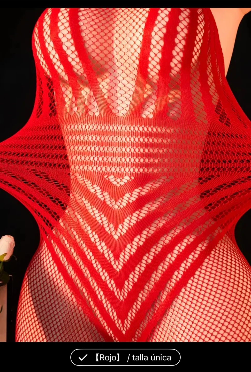 This red fishnet bodysuit features a halter neck design and intricate chevron patterns. It's a one-size-fits-most garment. Its open-knit construction offers a unique look.