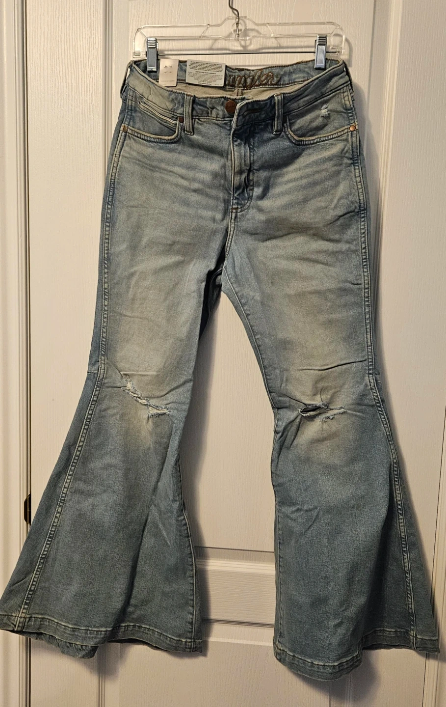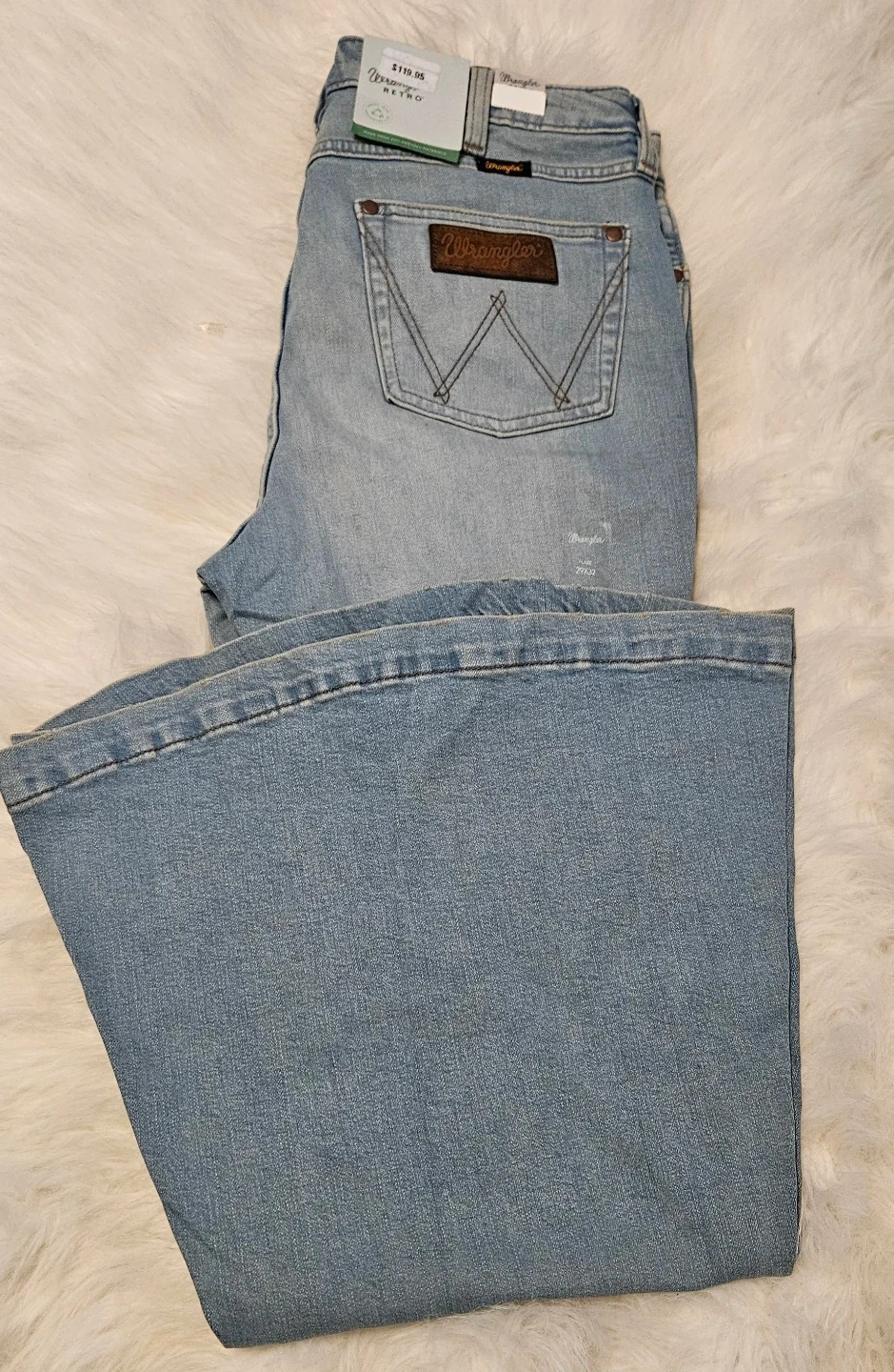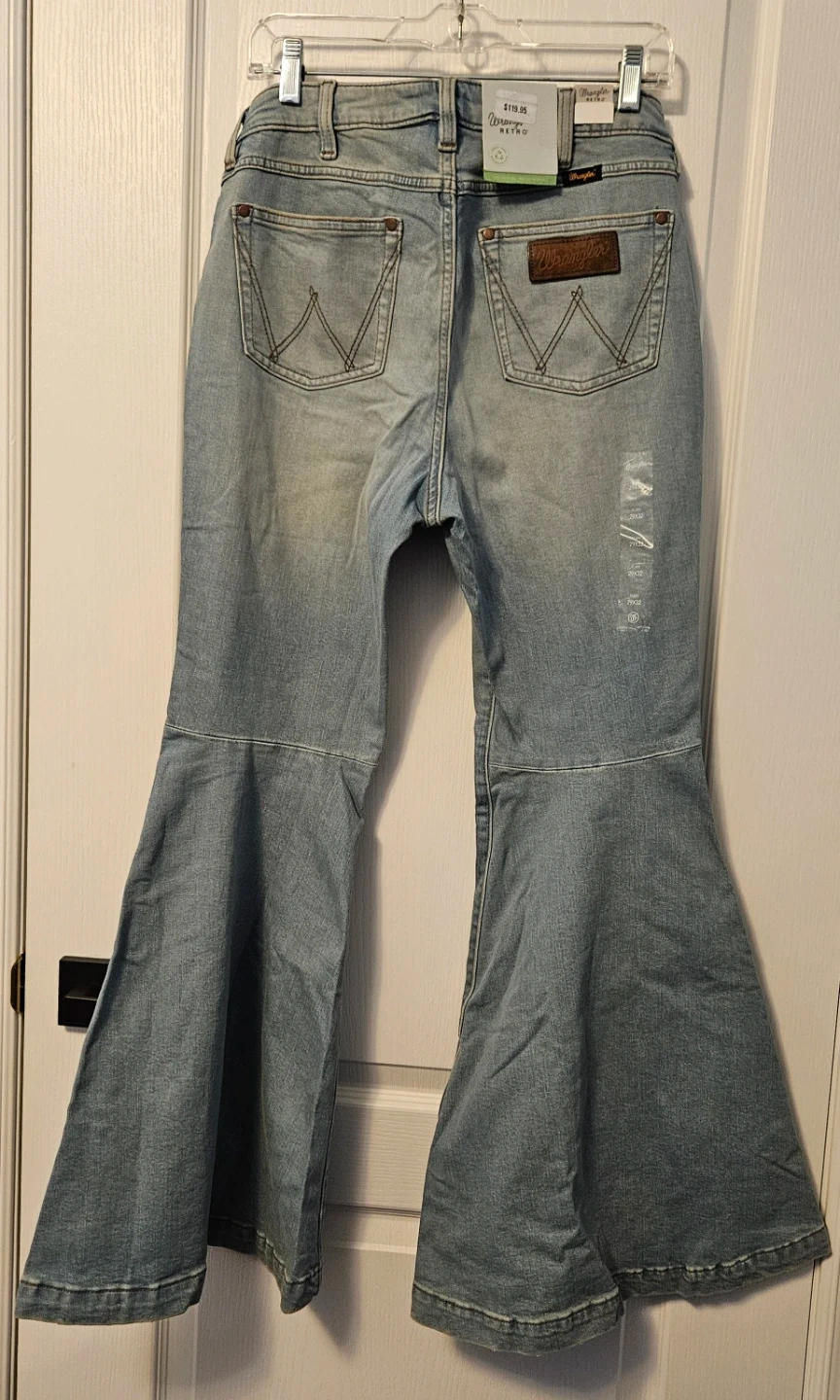 These light wash Wrangler Retro jeans are a women's size 29x32. They feature a flare leg style. Denim material.