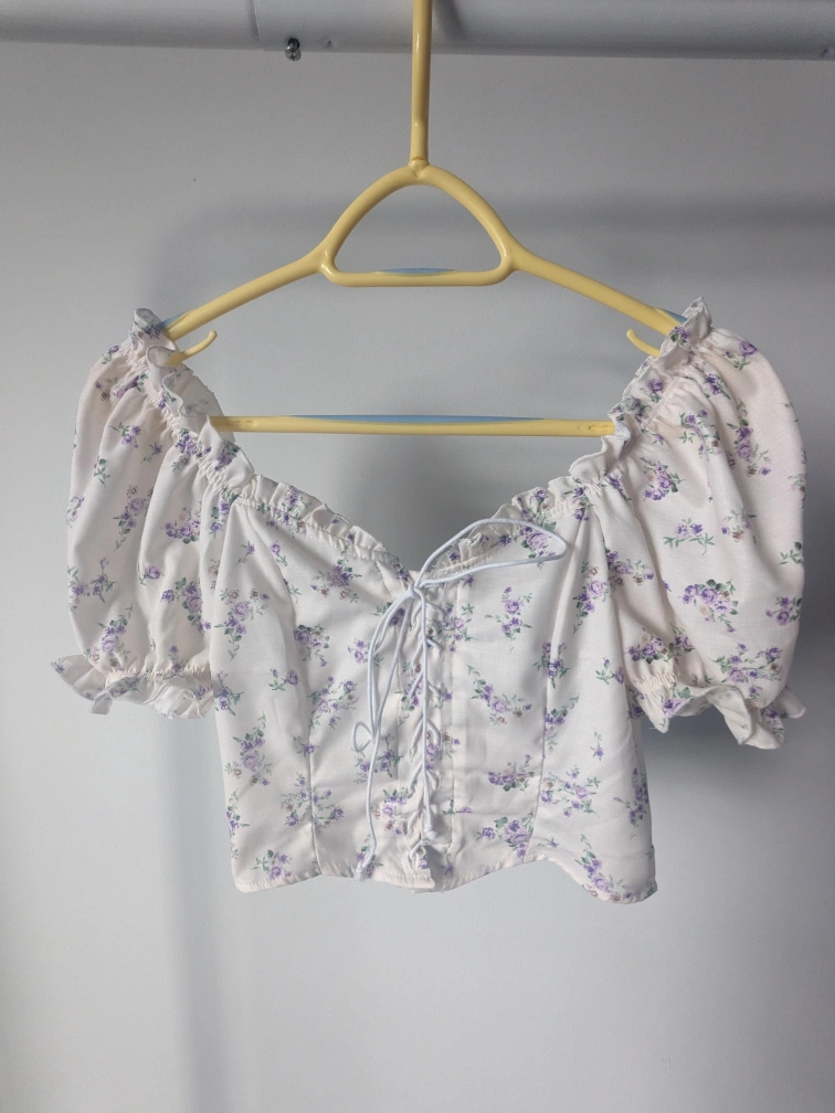 White/Cream crop top with a lace-up front and short puff sleeves. Features a floral purple pattern throughout.