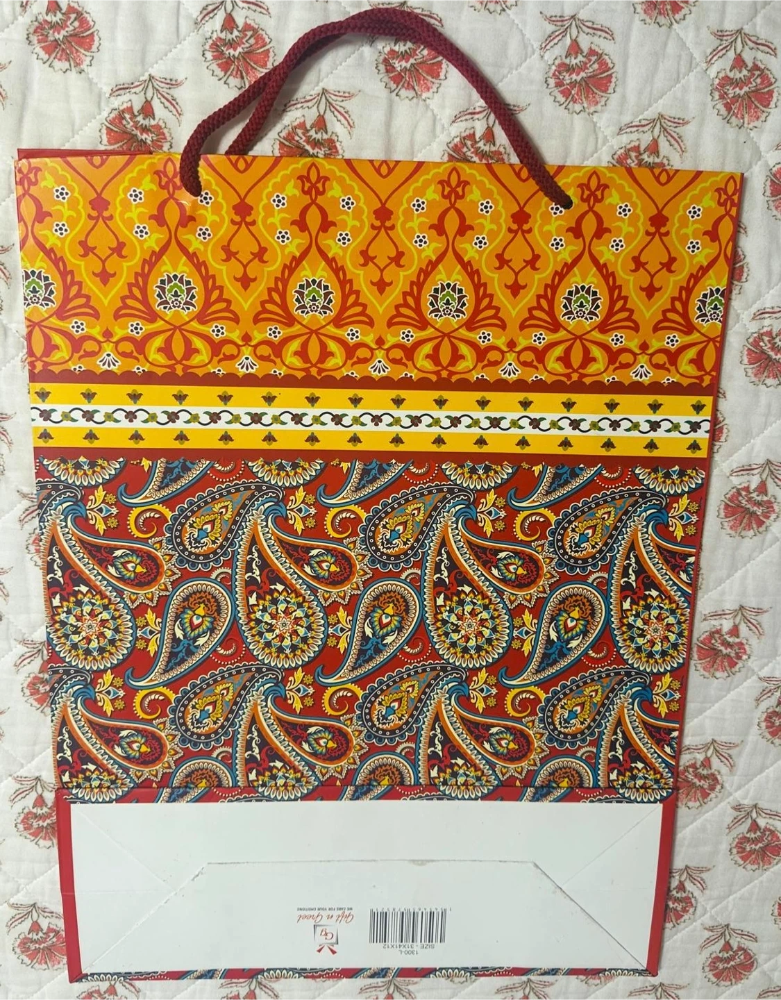 Here is a gift paper bag with a colorful design! It features a vibrant mix of red, yellow, and blue paisley patterns on the lower half, with a decorative band and a repeating floral motif on the upper half. Perfect for gifting! It’s brand new …$3 each or $5 for both