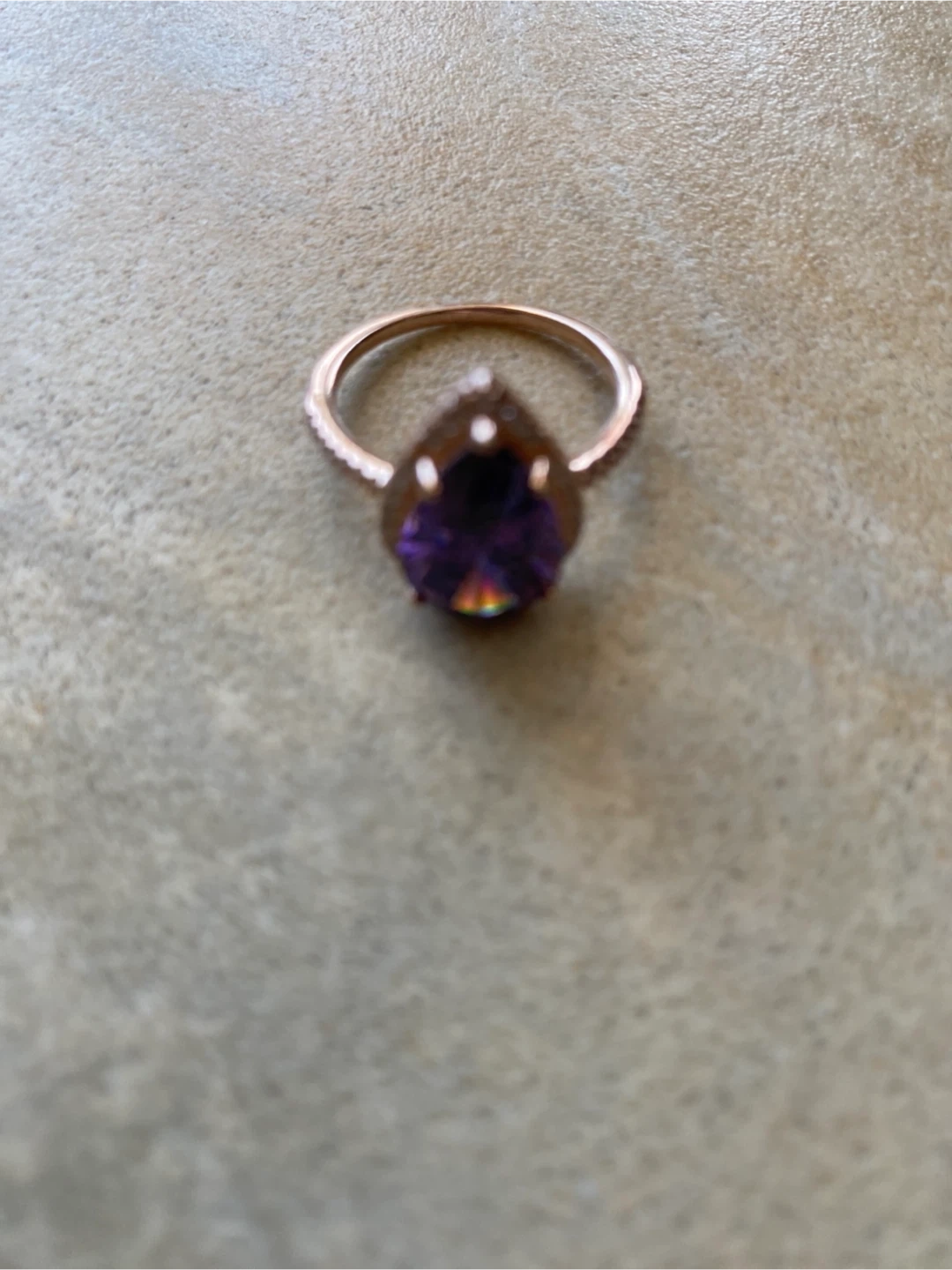 This ring features a pear-shaped purple stone, likely amethyst, set in a rose gold band. The stone is surrounded by smaller clear stones. It comes with a red velvet ring box, perfect for gifting or safekeeping. The band looks is a size 7.