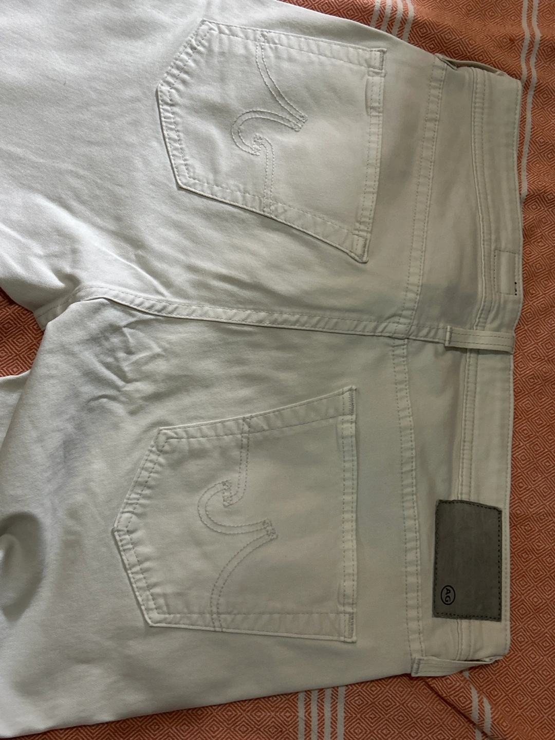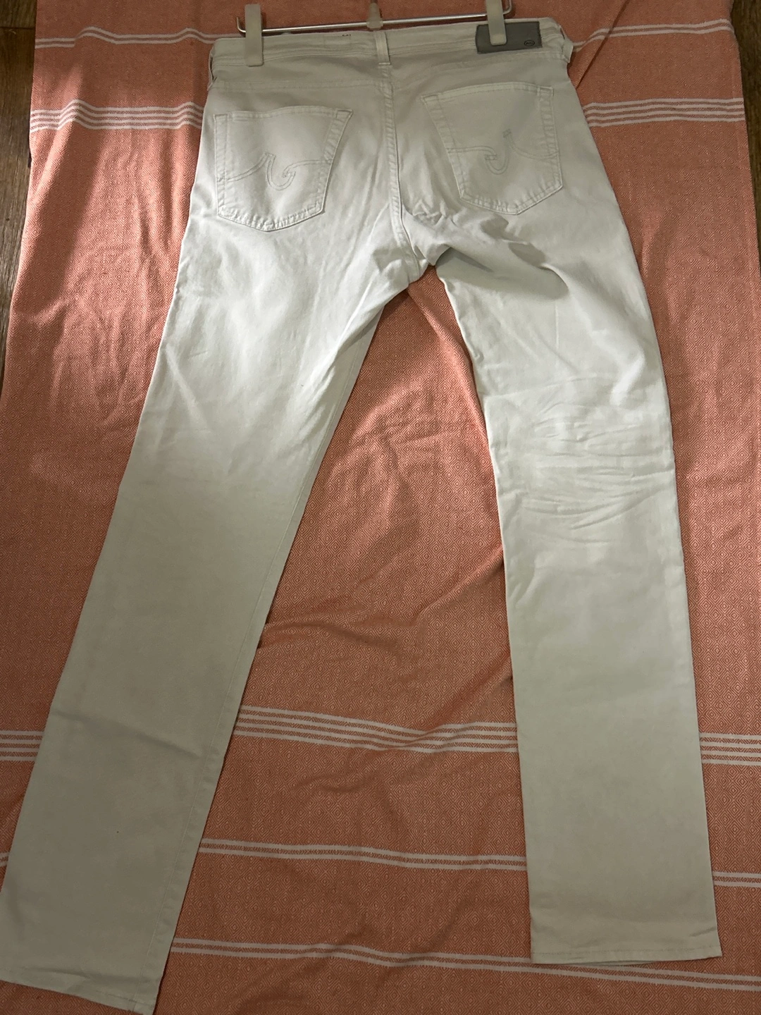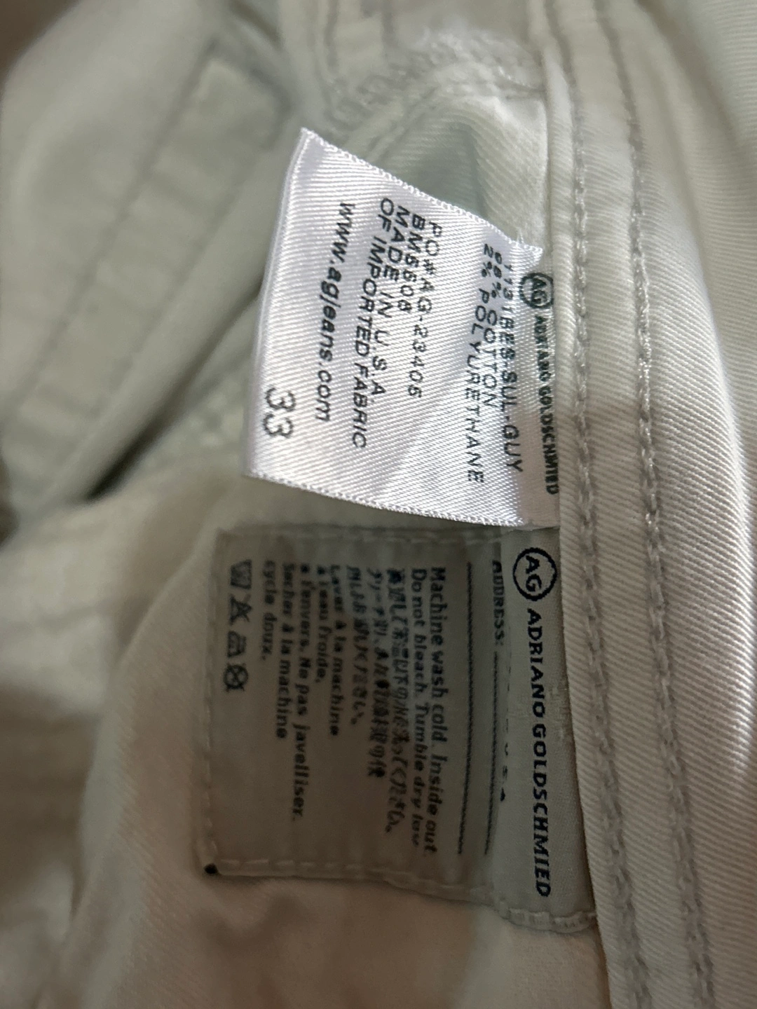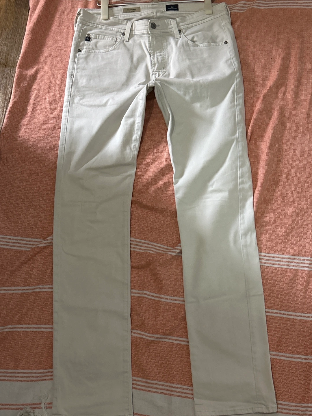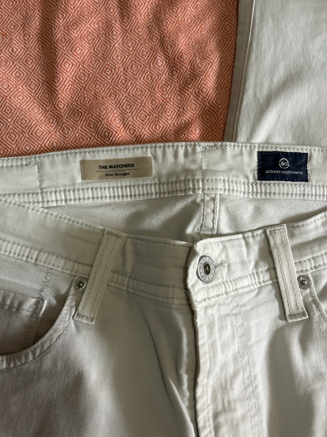 These are AG Adriano Goldschmied jeans in the Matchbox Slim Straight style. They appear to be a light color, possibly off-white or beige. Great for a casual look! Size 33 and would say 34