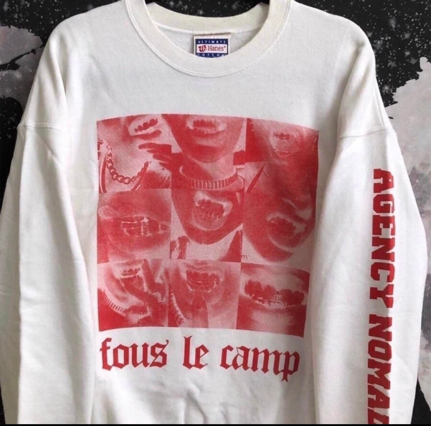 26Agency Nomadic ‘Fous Le Camp’ oversized baggy style Grills French quote sweatshirt, color is white with front graphic & lettering along sleeve. Preowned condition *Discoloration spot on left sleeve* *Fits towards an XL* Measurements (26”x28”)