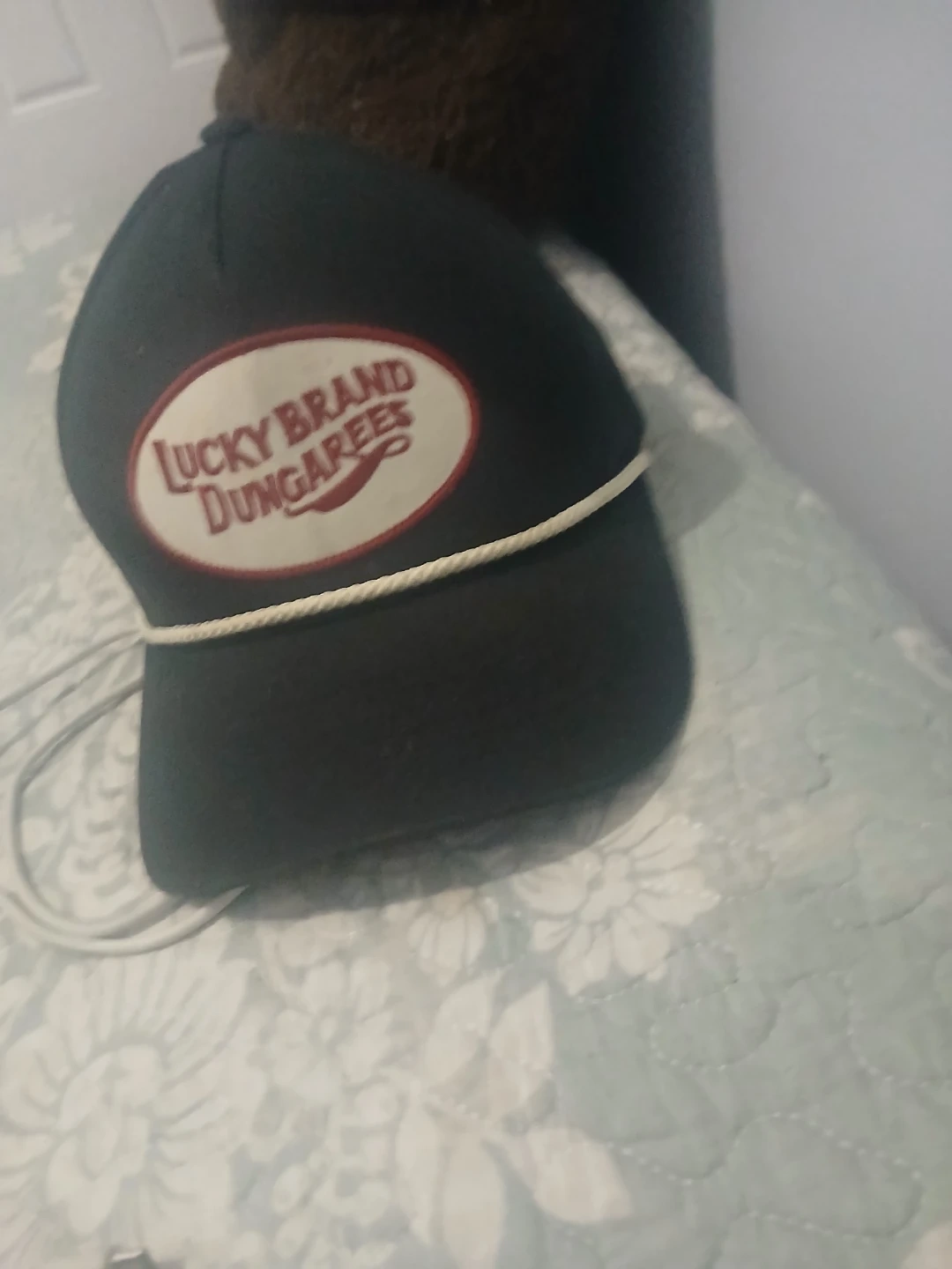 Lucky Brand Dungarees baseball cap. Dark blue with an oval logo patch. Features a rope detail across the brim.