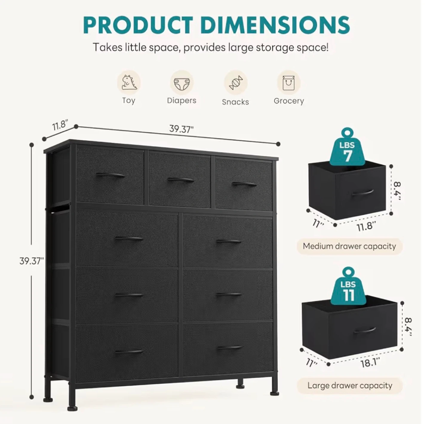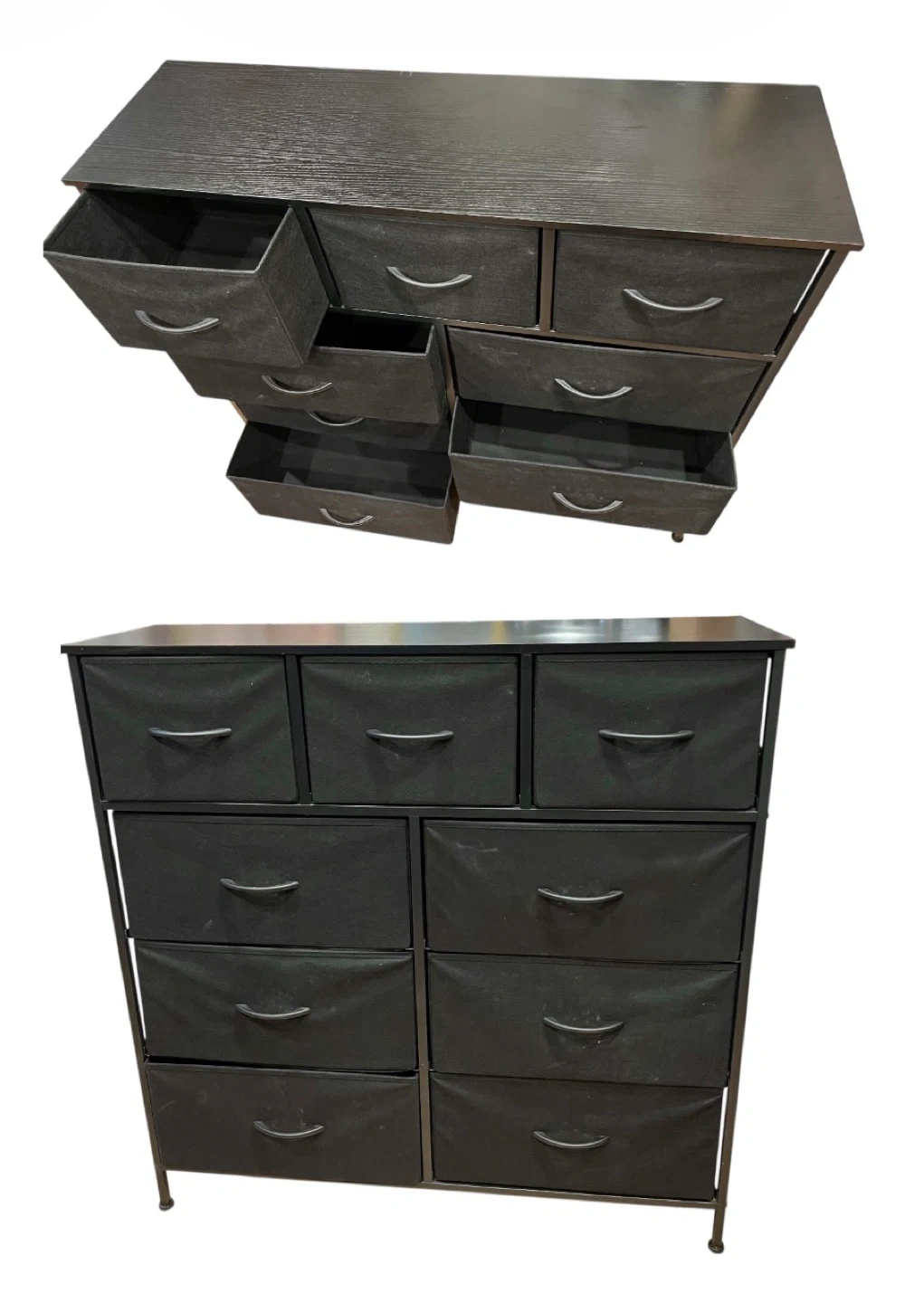 This fabric dresser offers 9 drawers each dresser . It features a black metal frame and black fabric drawers with handles. Dimensions are posted. Great for organizing clothes or other household items!