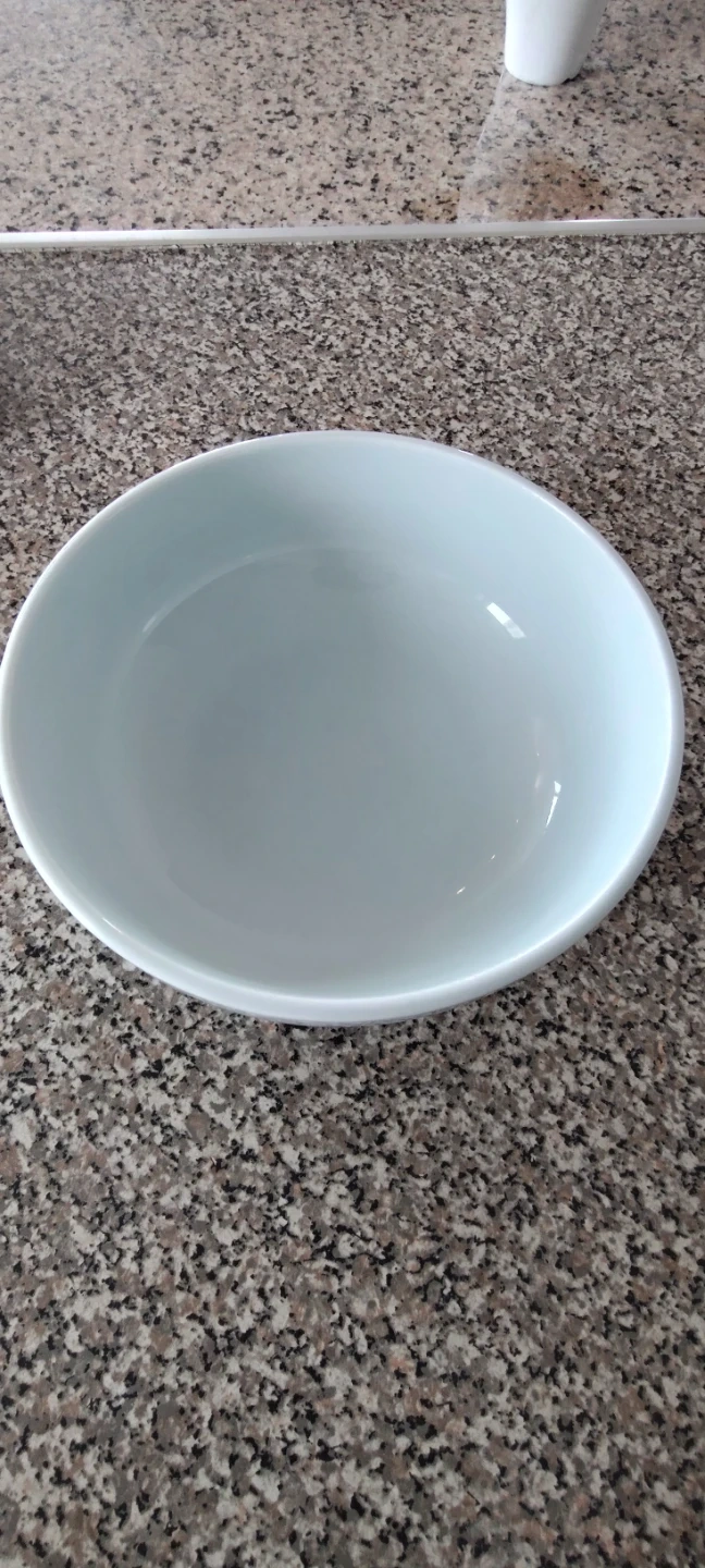 A sturdy light blue ceramic bowl. It's approximately 8 inches in diameter. This bowl is suitable for serving individual portions of soup or salad.