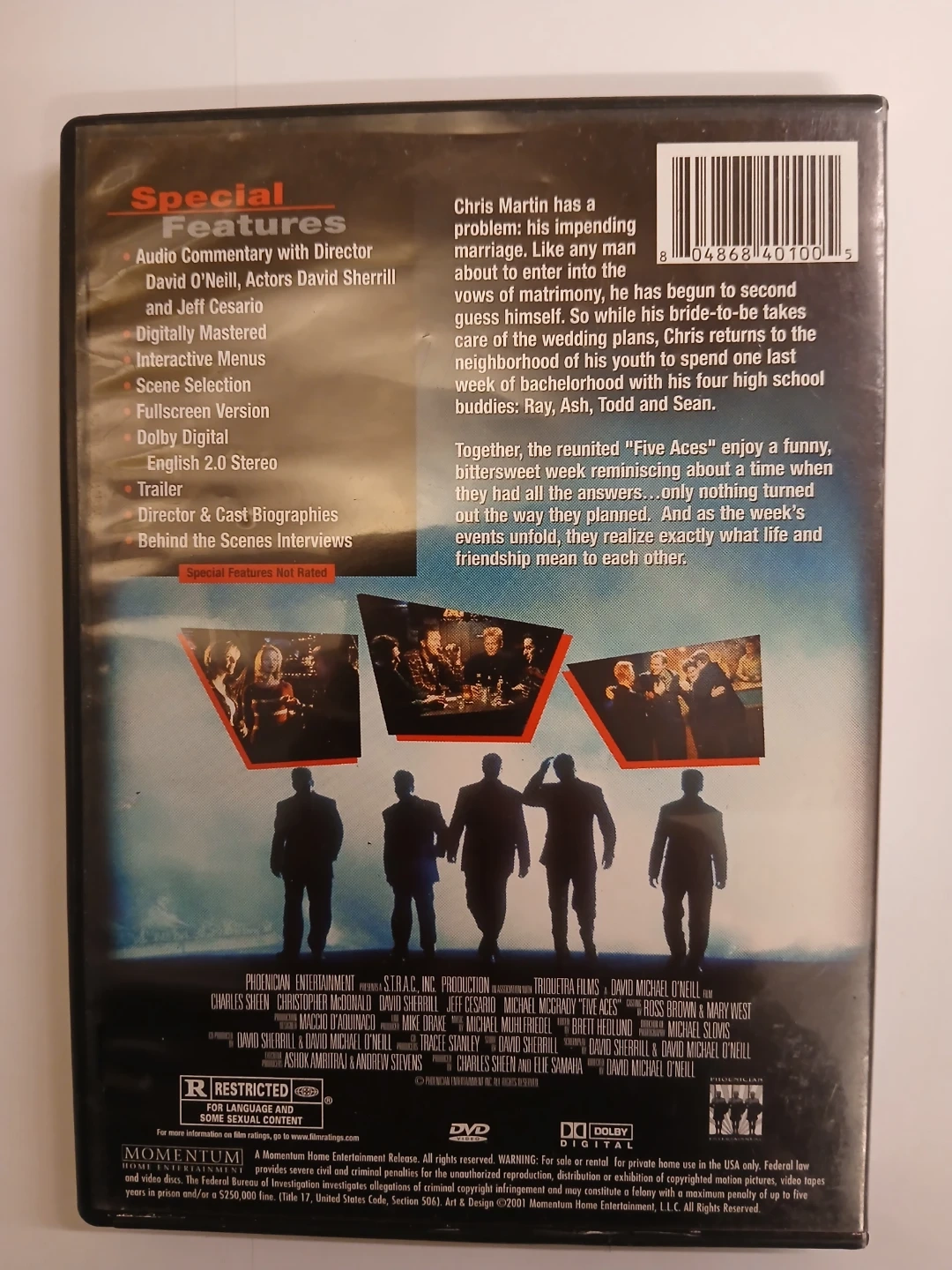 This DVD features the movie Five Aces starring Charles Sheen and Christopher McDonald. It includes special features like audio commentary, director's cast biographies, and behind-the-scenes interviews. Fullscreen version and Dolby Digital 2.0 stereo sound are also included.