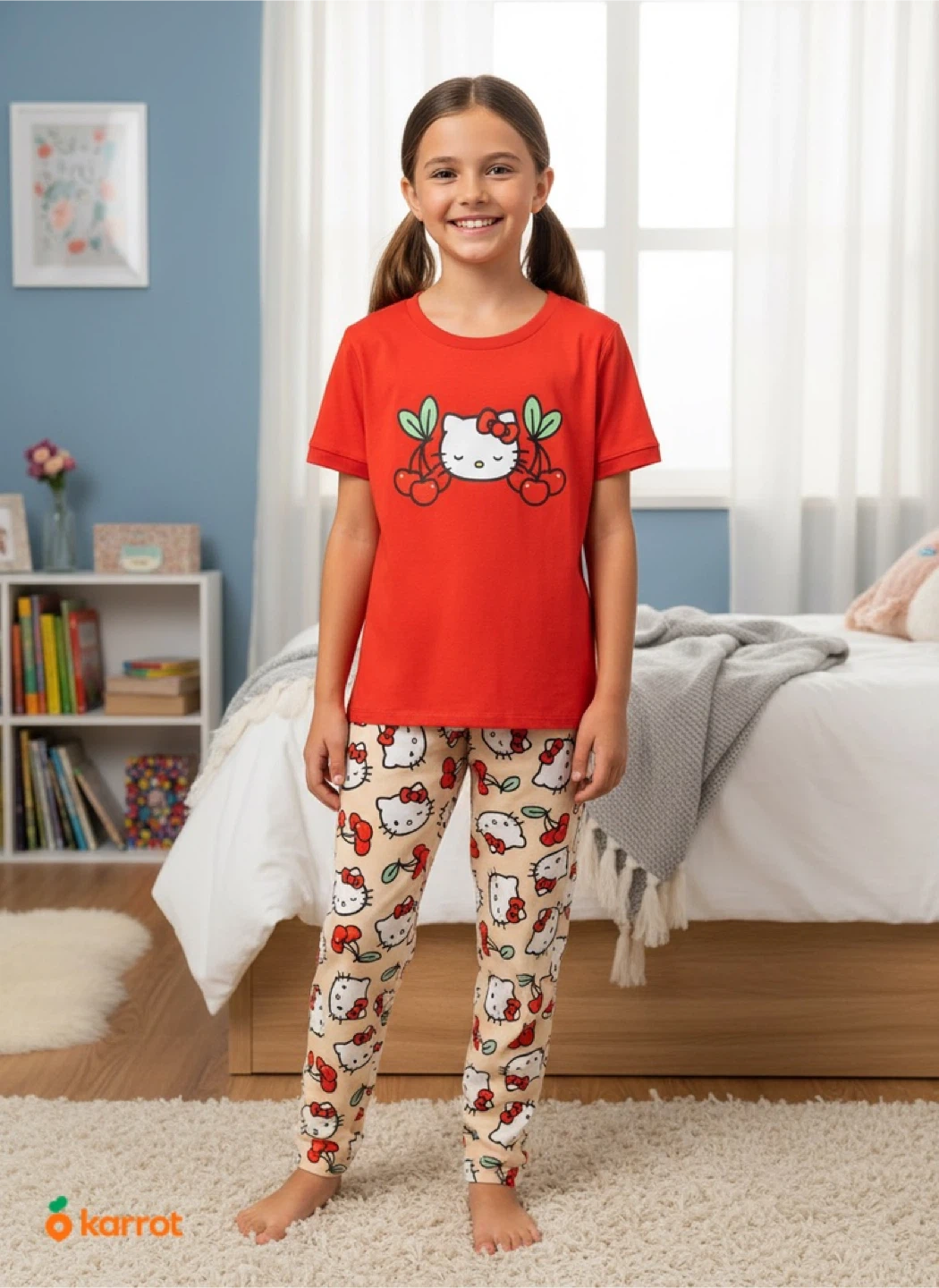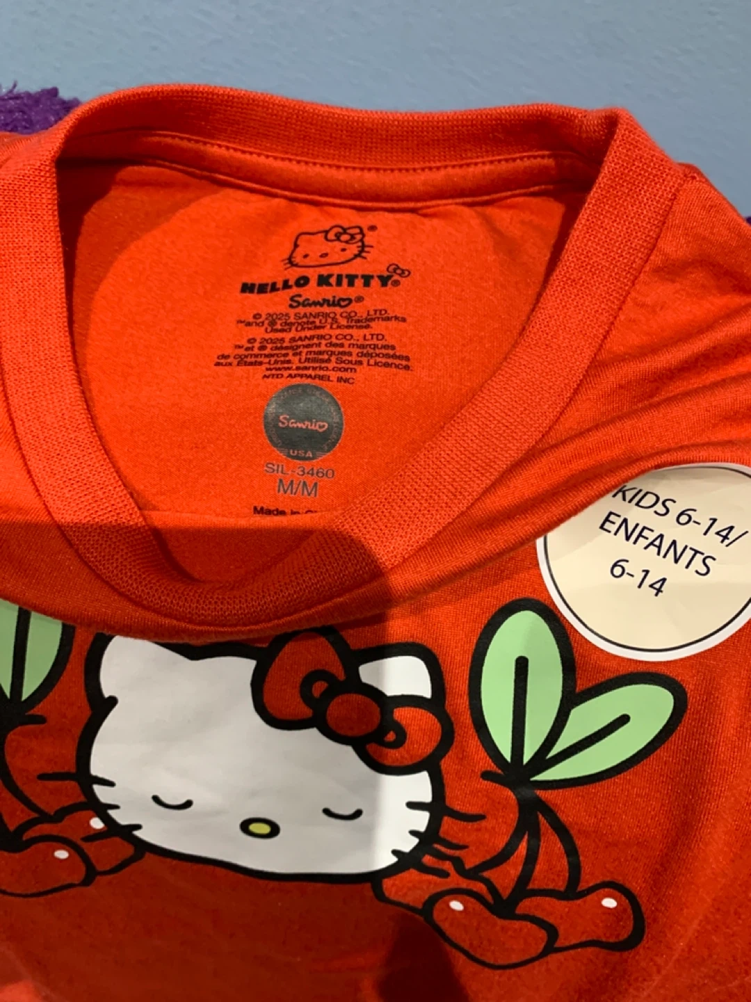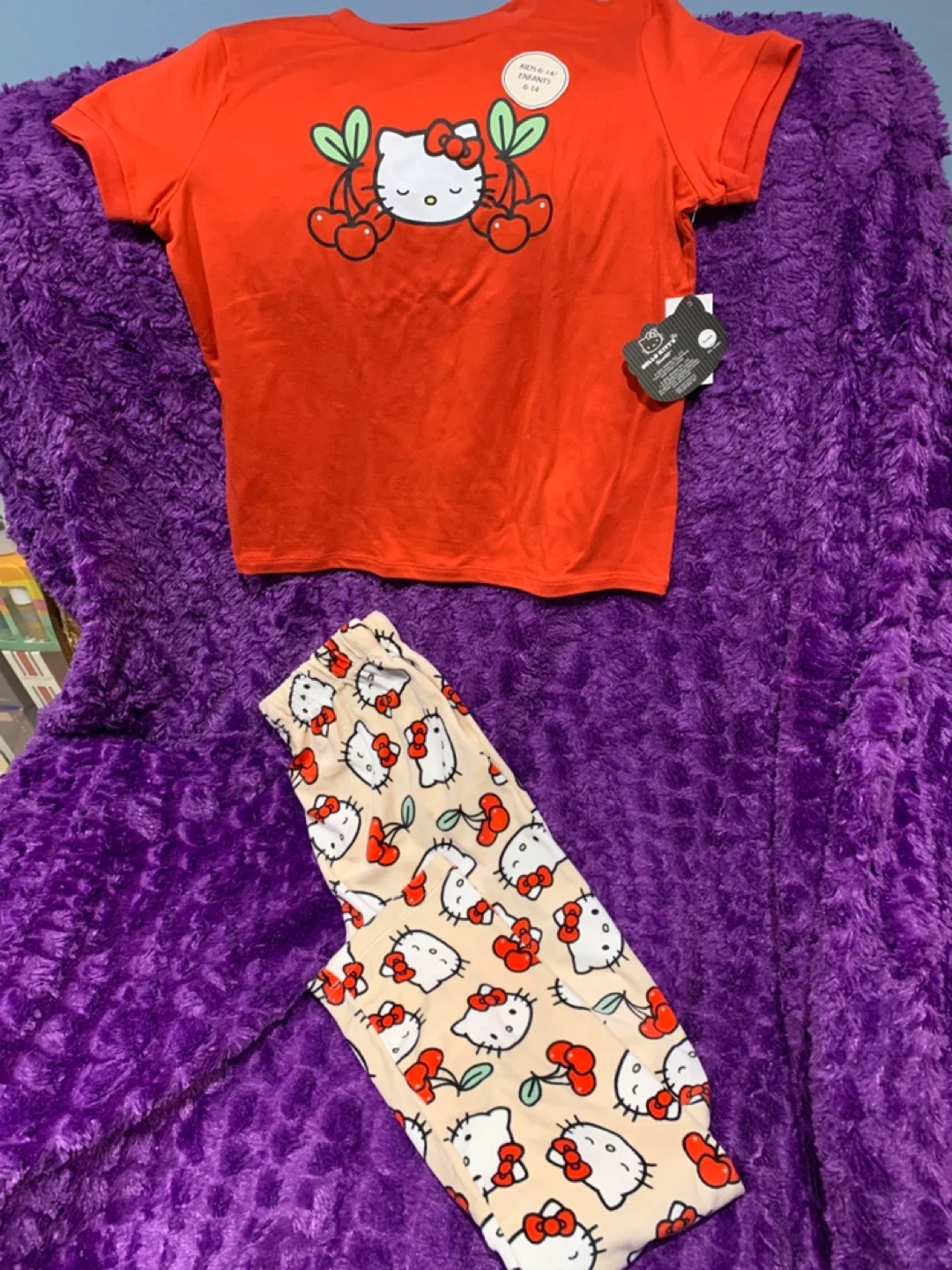 This is a cute Hello Kitty pajama set featuring a cherry design. It's for kids ages 6-14, size Mes-Great for sleeping or lounging!