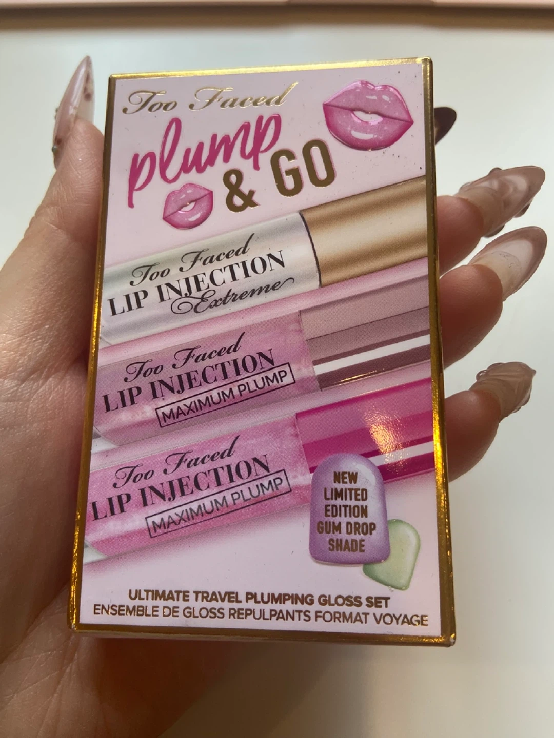 This set includes Too Faced Lip Injection Extreme and two Lip Injection Maximum Plump glosses. It's a new limited edition Gum Drop shade. This set is perfect for travel and gives your lips a plumper look!