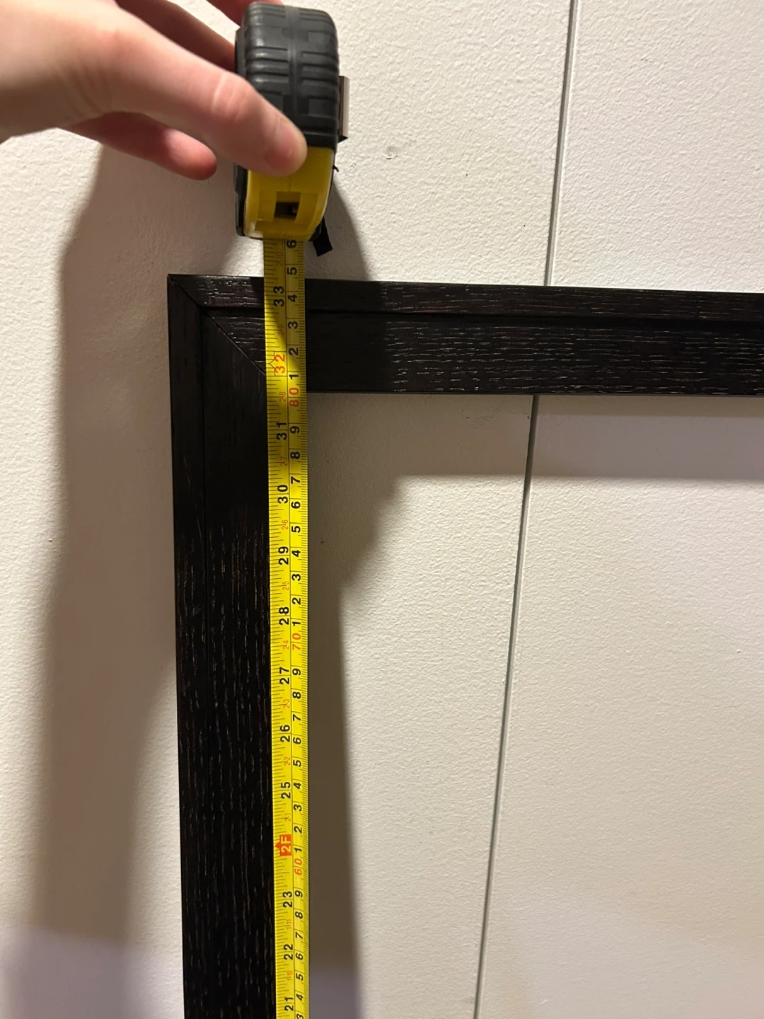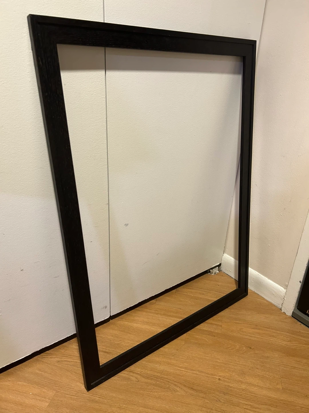 Selling a dark brown wooden picture frame! The dimensions are approximately 26.5 inches by 32.5 inches. It's a great frame for displaying your favorite photos or artwork.