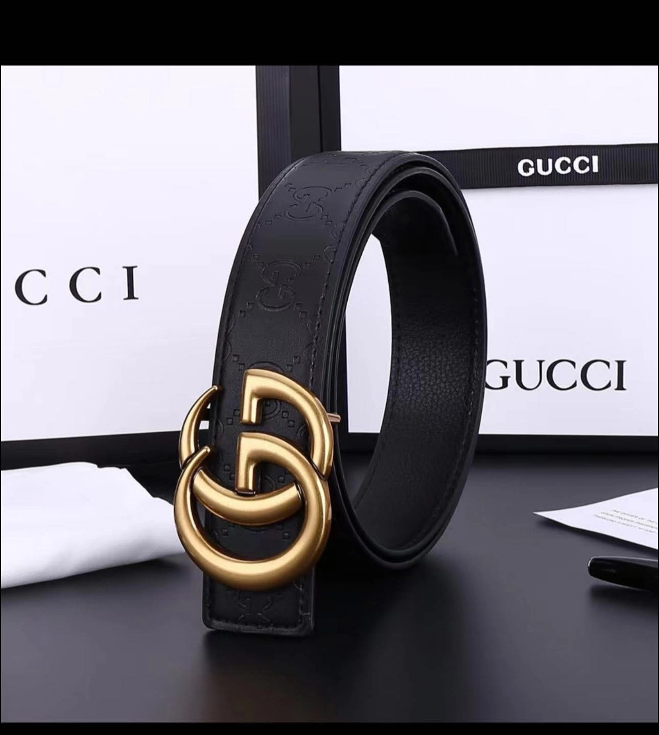 Selling a stylish Gucci belt in black leather with a gold buckle. It's in great condition and comes with the original box. A classic accessory to elevate any outfit!