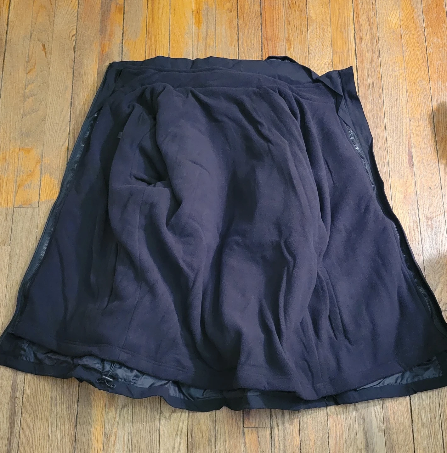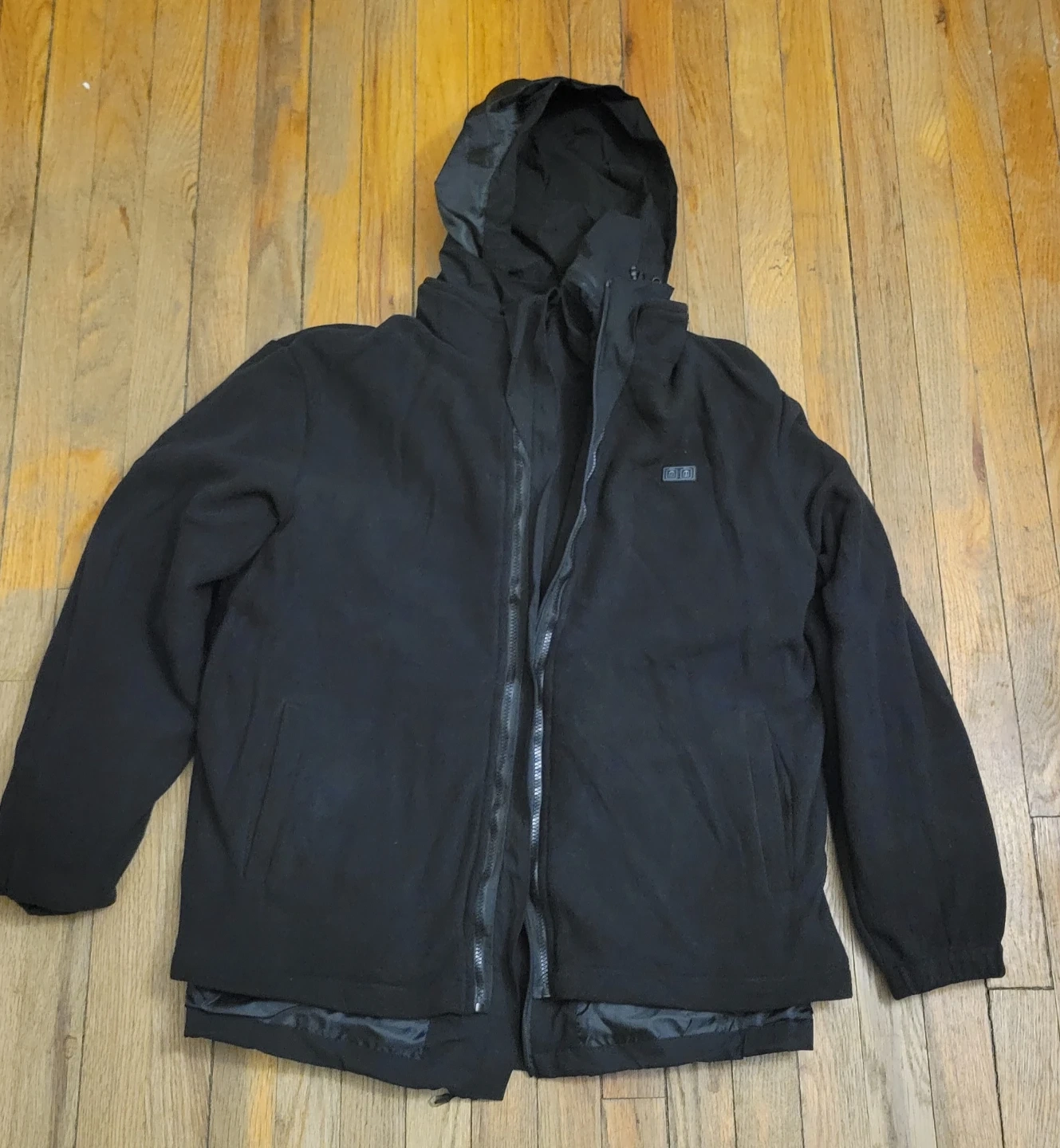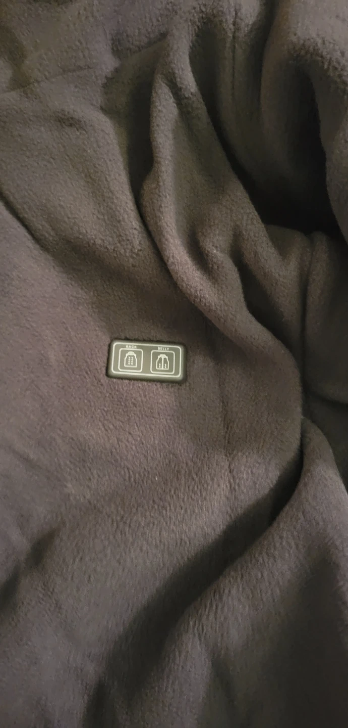 This black heated jacket is designed for warmth and comfort. It includes a power bank and charging cable to activate the heating elements. The jacket also comes with a travel case and a pouch for accessories. It's made with a soft fleece lining and a water-resistant outer shell.