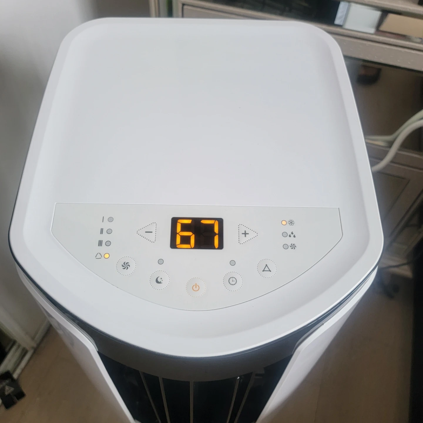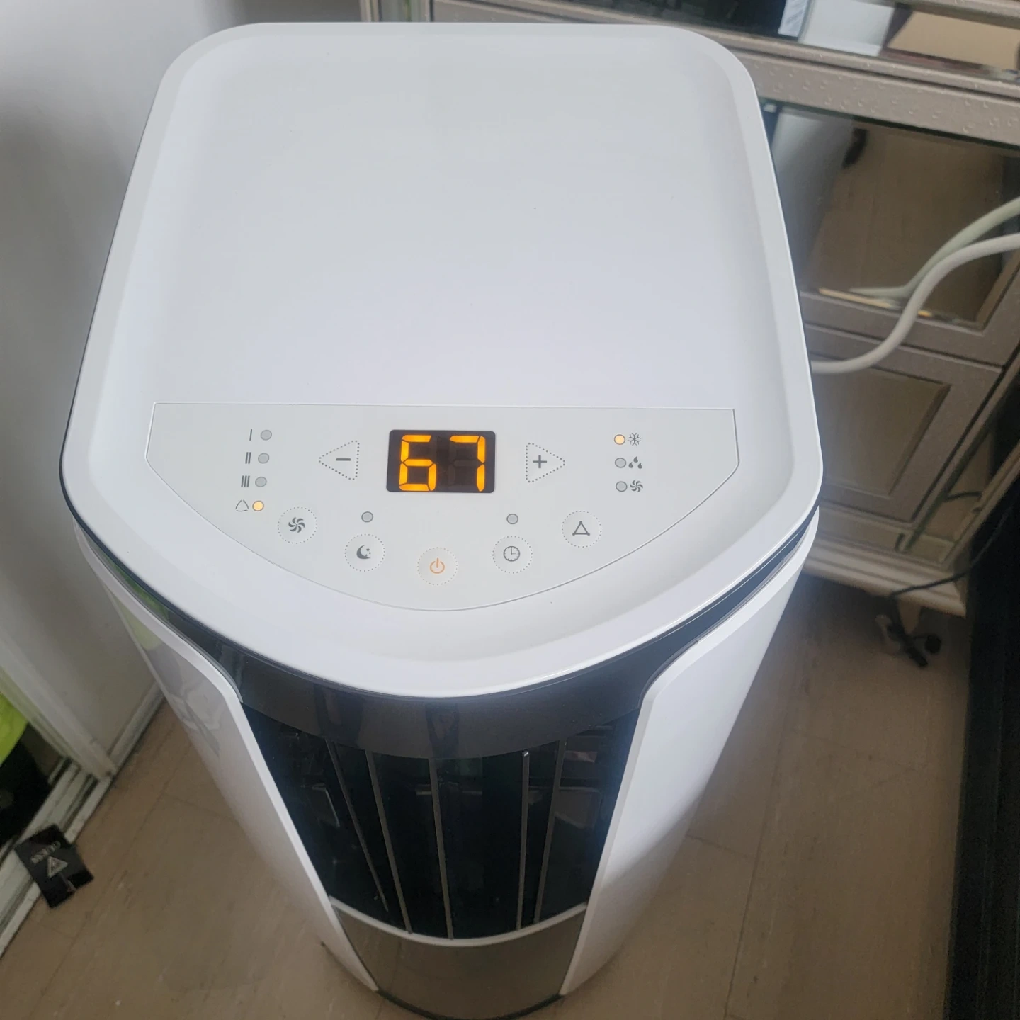 This portable air conditioner is white and black. 10.000btu It has multiple fan speeds and a timer function. Great for keeping a room cool!