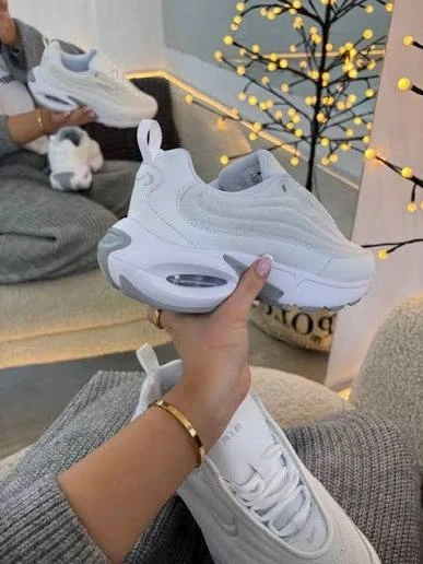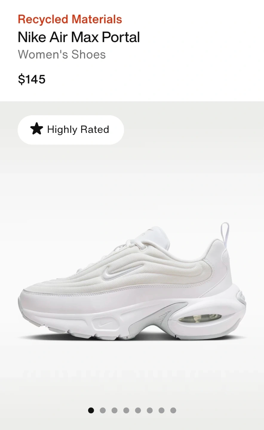 White Nike Air Max Portal shoes for women. These highly rated sneakers are made with recycled materials. They offer a comfortable fit and stylish design for everyday wear. SIZE US 7.5 /245cm