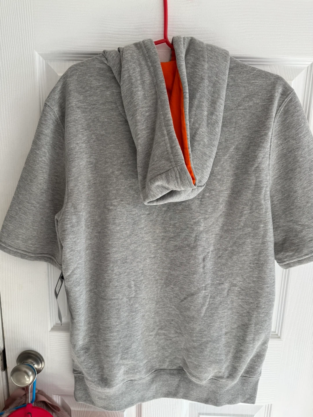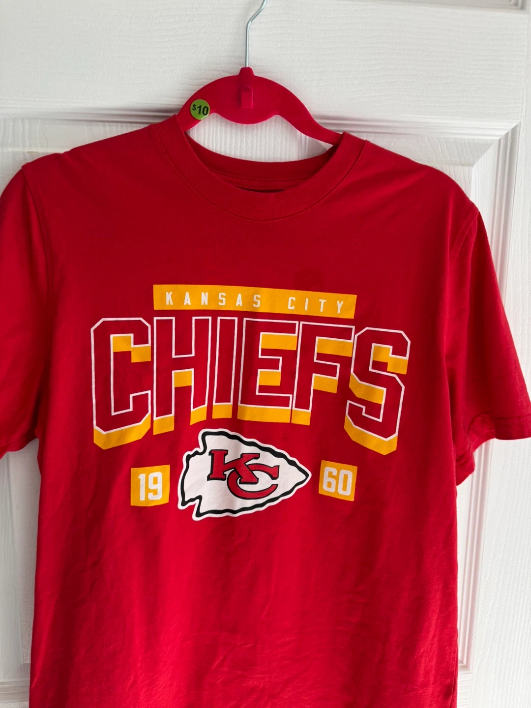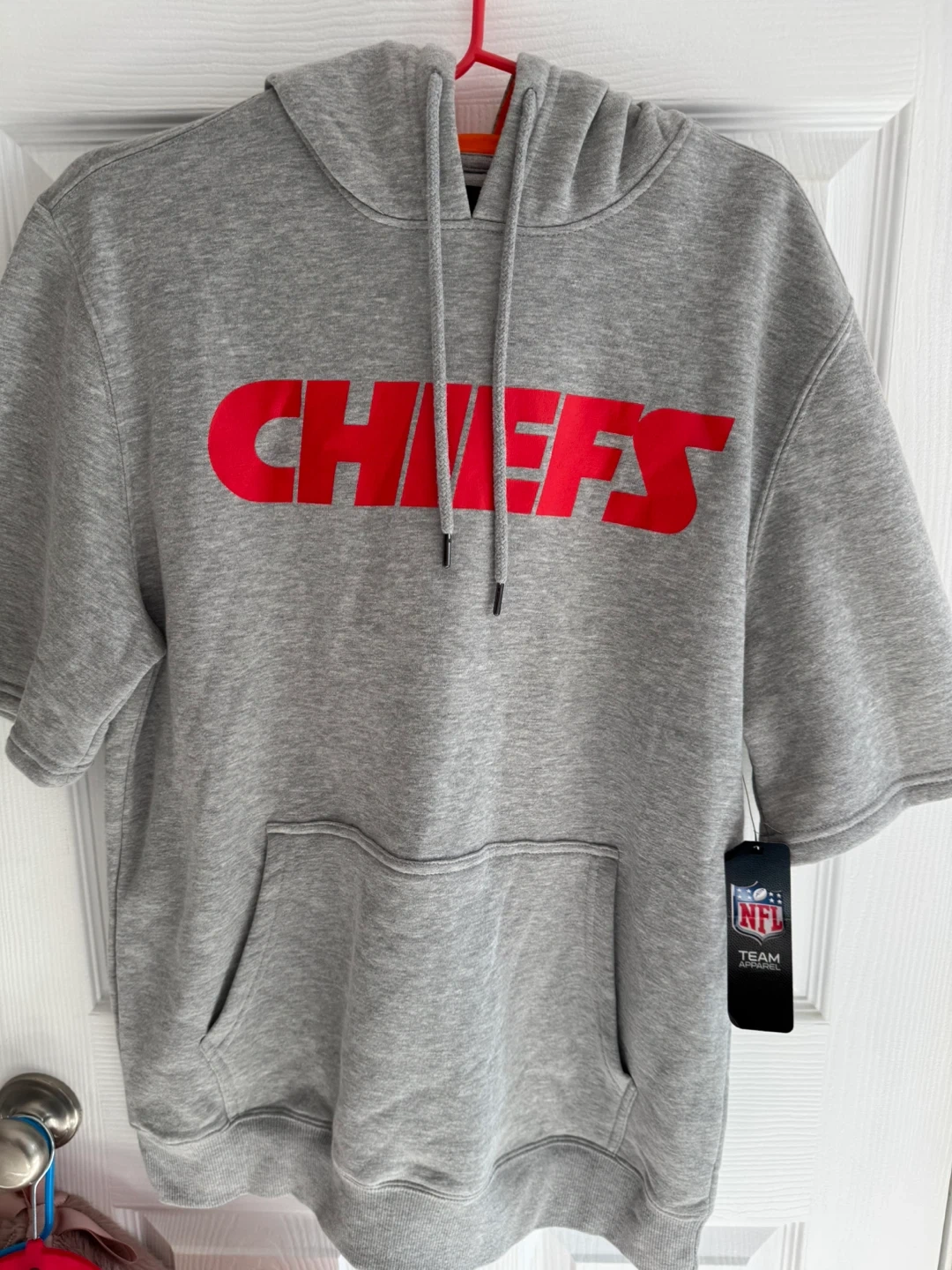 Selling a Kansas City Chiefs short sleeve hoodie in gray that comes with a FREE Kansas City Chiefs T-shirt in red. Both are in great condition and ready for a new fan!