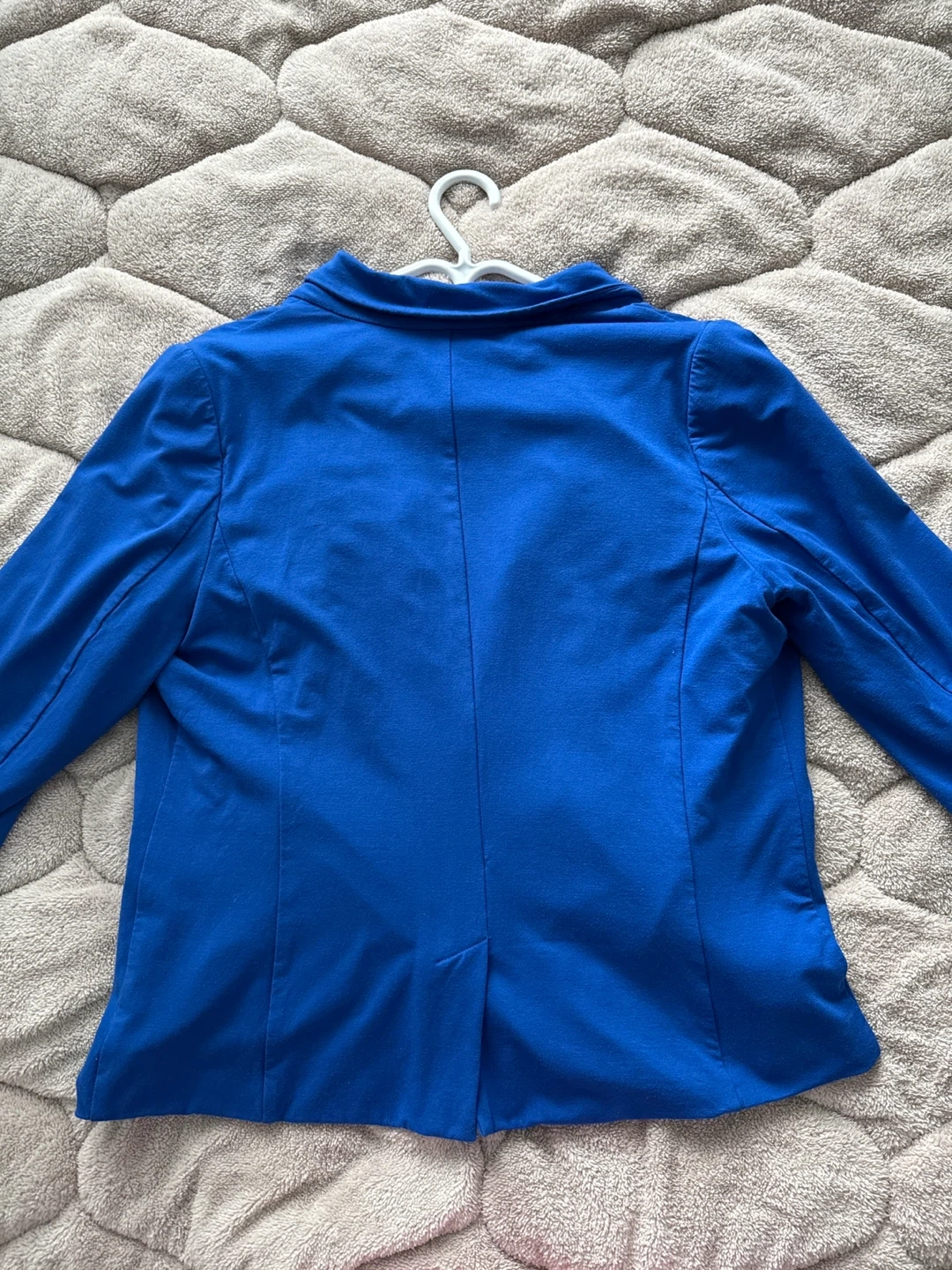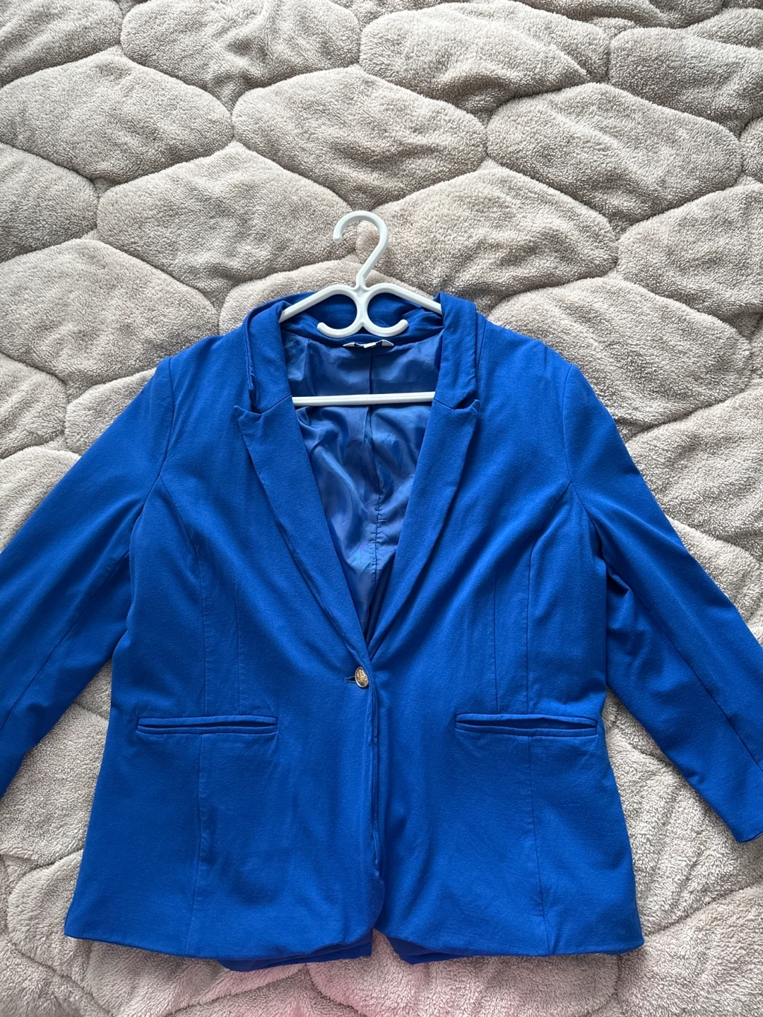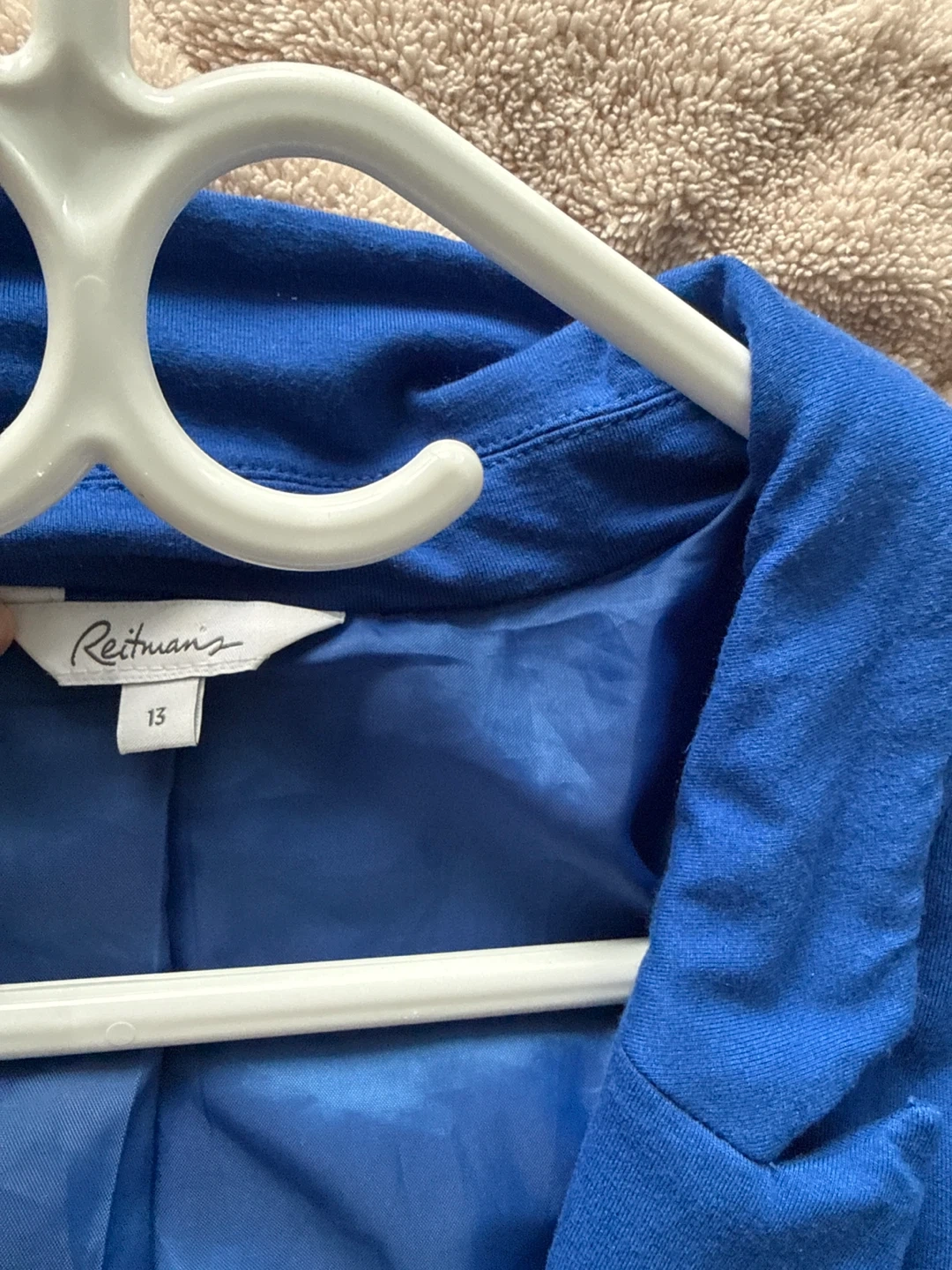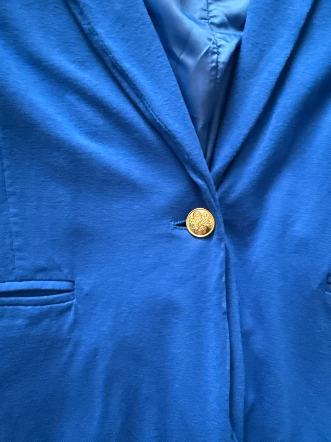 This Reitmans blazer is a vibrant royal blue. It features a single gold button closure and two front pockets. The lining is a satin-like material. Size is 13.