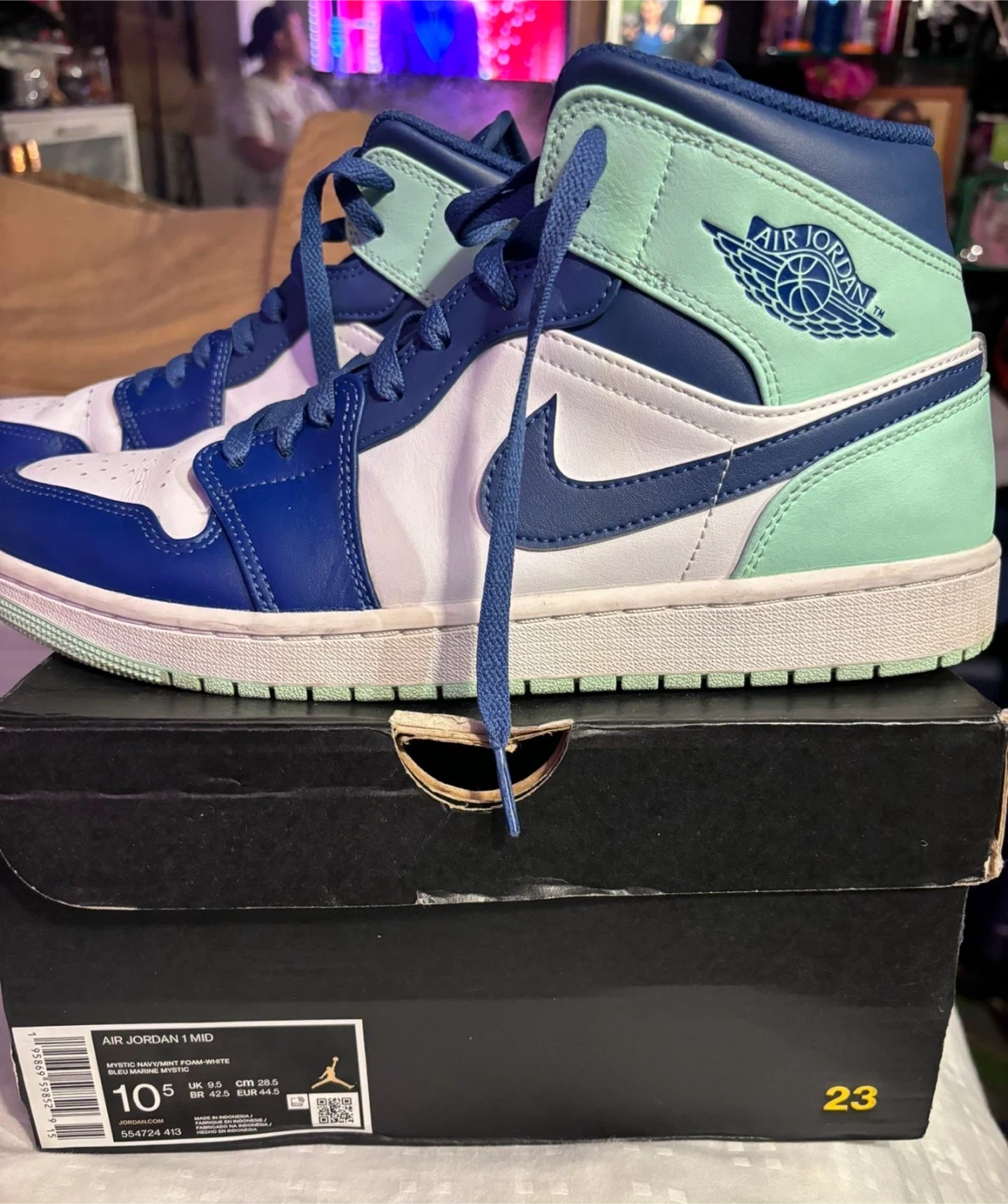 15Selling a pair of Air Jordan 1 Mid sneakers in size 10.5. The colorway is Mystic Navy/Mint Foam-White. They come with the original box!