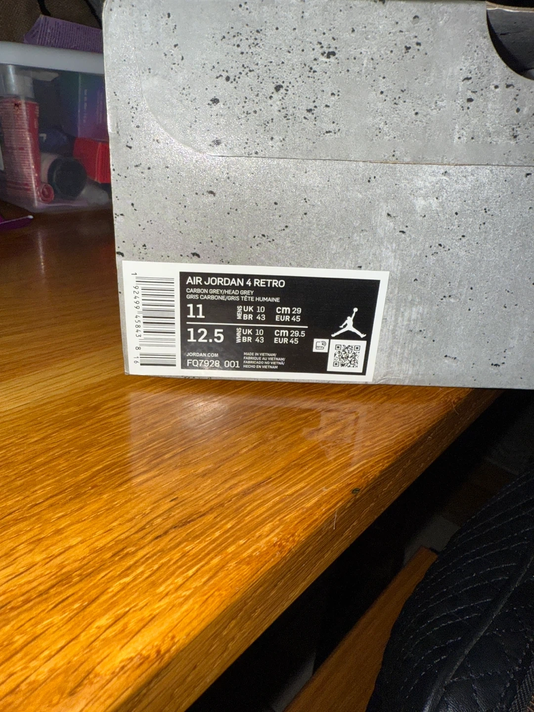 Selling a pair of Air Jordan 4 Retro Wet Cement sneakers in the Carbon Grey color. They are a US size 11 and come with the original box. Worn twice tops. Great condition. Great for any sneaker enthusiast!