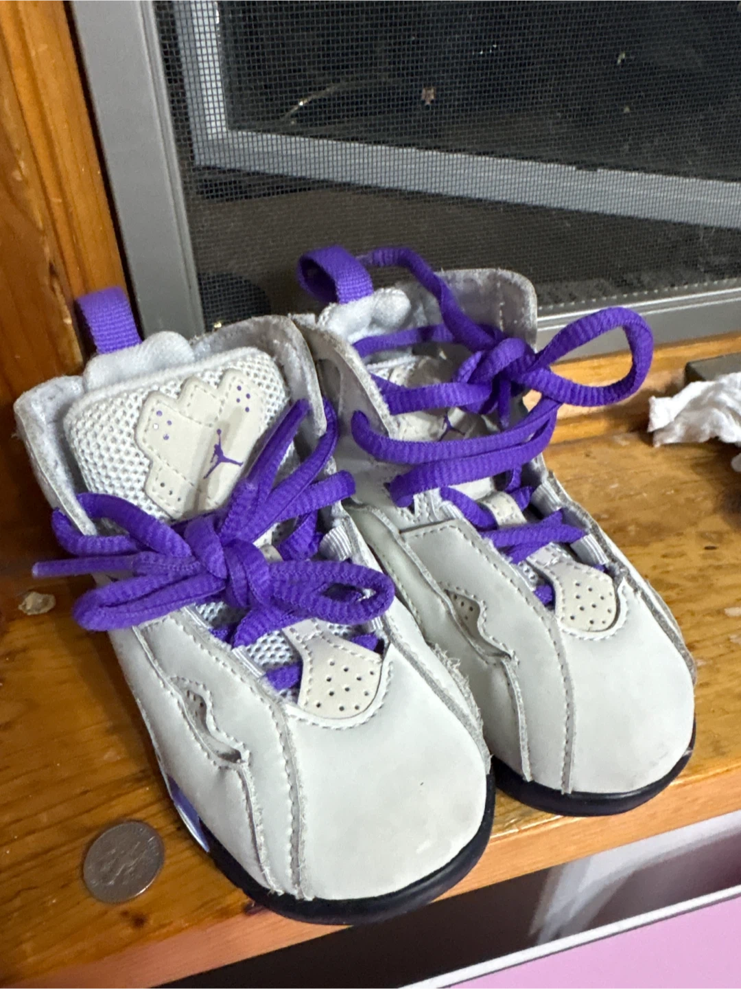15Selling a pair of Air Jordan 7 Retro toddler shoes. They feature a white and purple color scheme and are in good condition. Perfect for your little one!