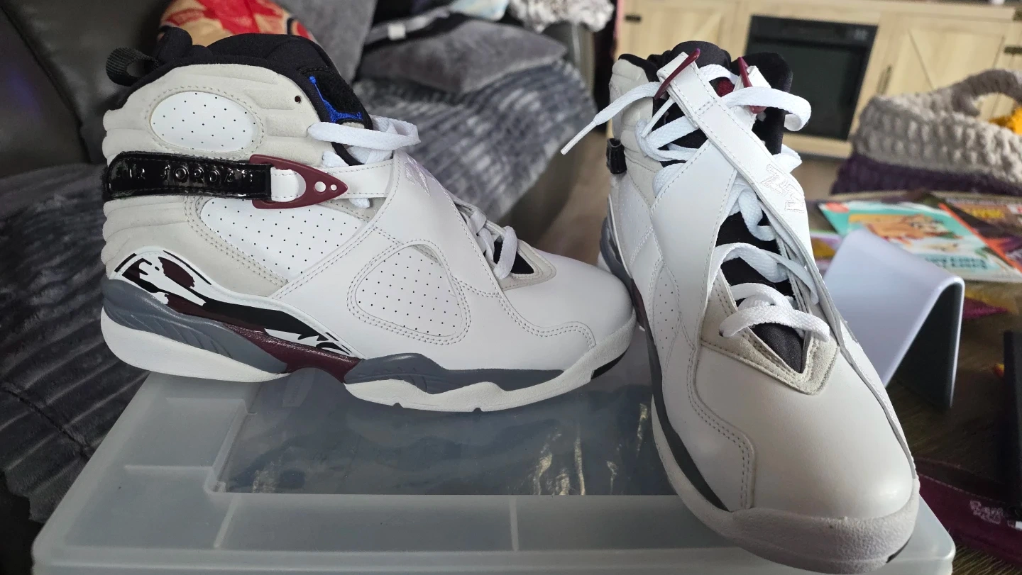 65Selling a pair of Air Jordan 8 Retro OVO in white! They are size 8.5 US. The shoes have a stylish design and are in good condition, ready for a new owner to enjoy