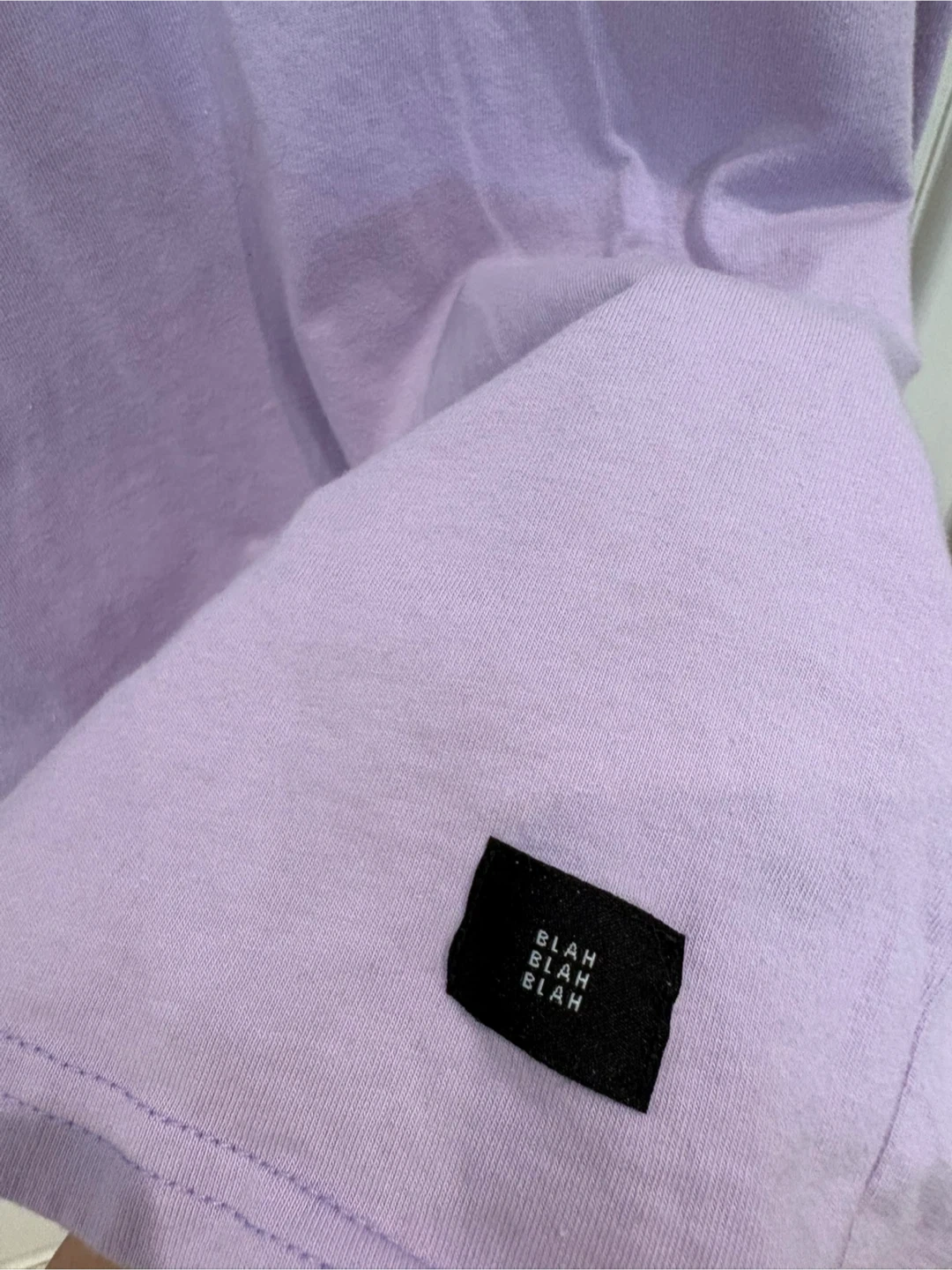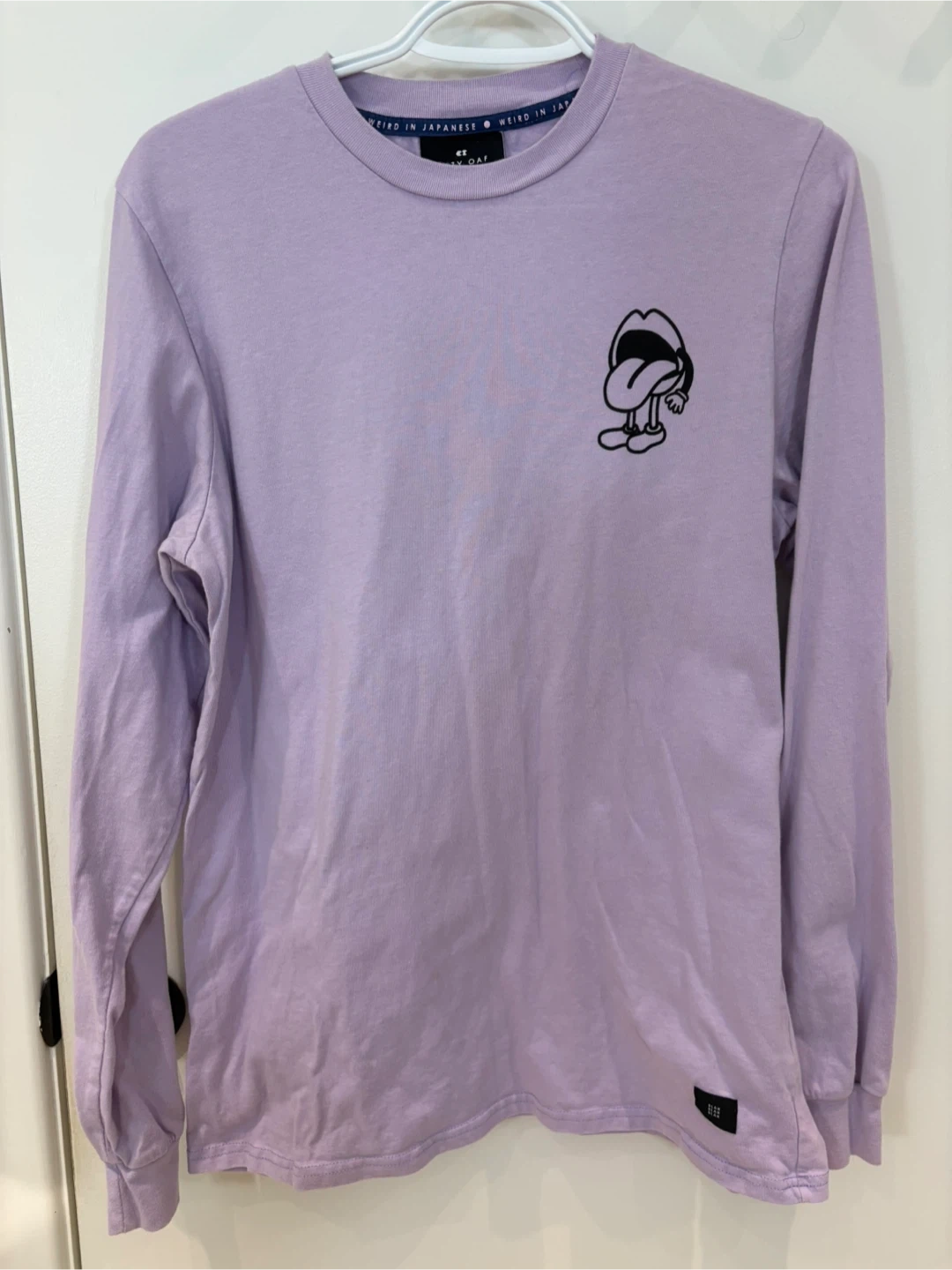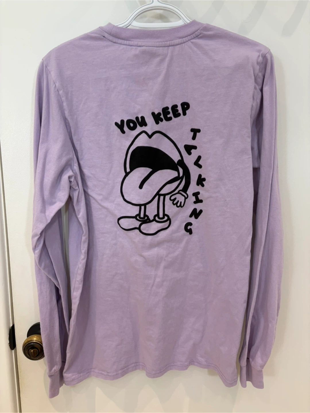 This is a lilac long-sleeved t-shirt from Lazy Oaf. It features a graphic of a mouth with a tongue sticking out on the front and the text "YOU KEEP TALKING" on the back. The shirt is size small. It's made of 100% cotton. It is an oversized fit.