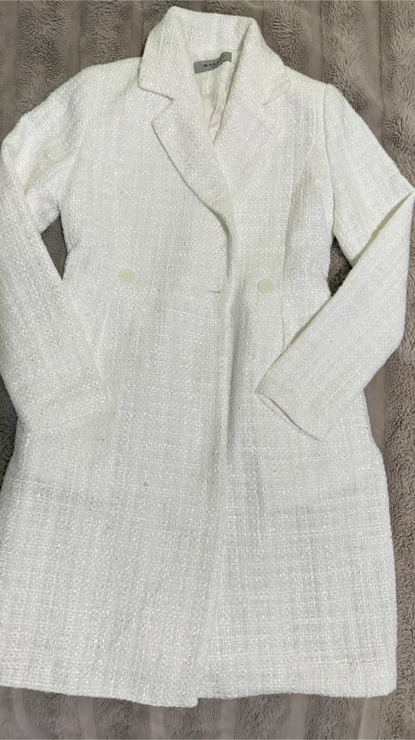Chic white double-breasted tweed dress. It's a stylish blazer-style dress with a textured fabric and subtle shimmer. Perfect for a sophisticated look!