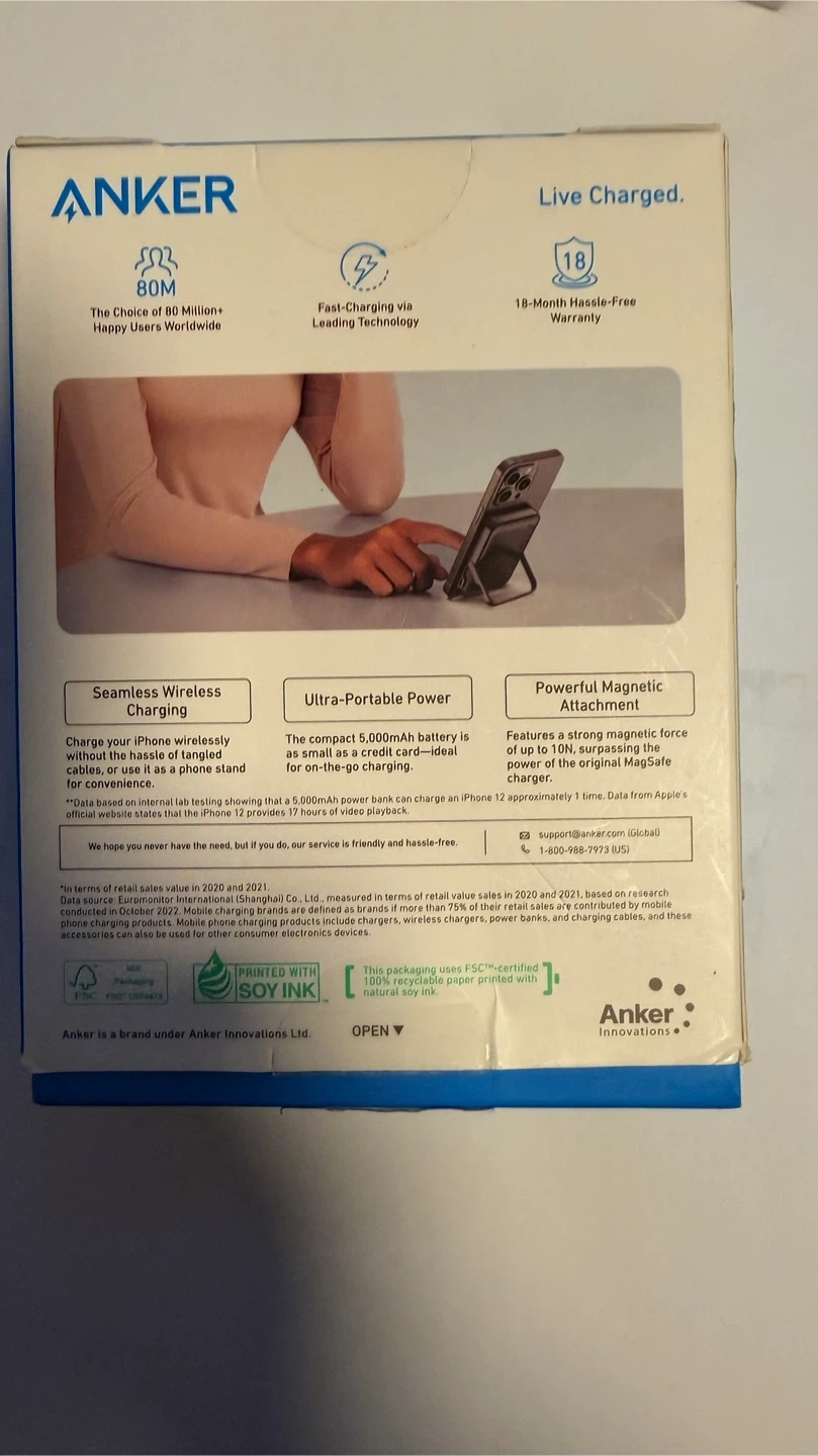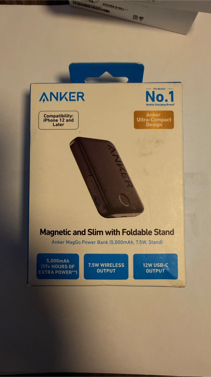 Anker MagGo Power Bank with a 5,000mAh capacity. It's magnetic and slim with a foldable stand. Offers 7.5W wireless output and 12W USB-C output. Great for iPhones 12 and later.