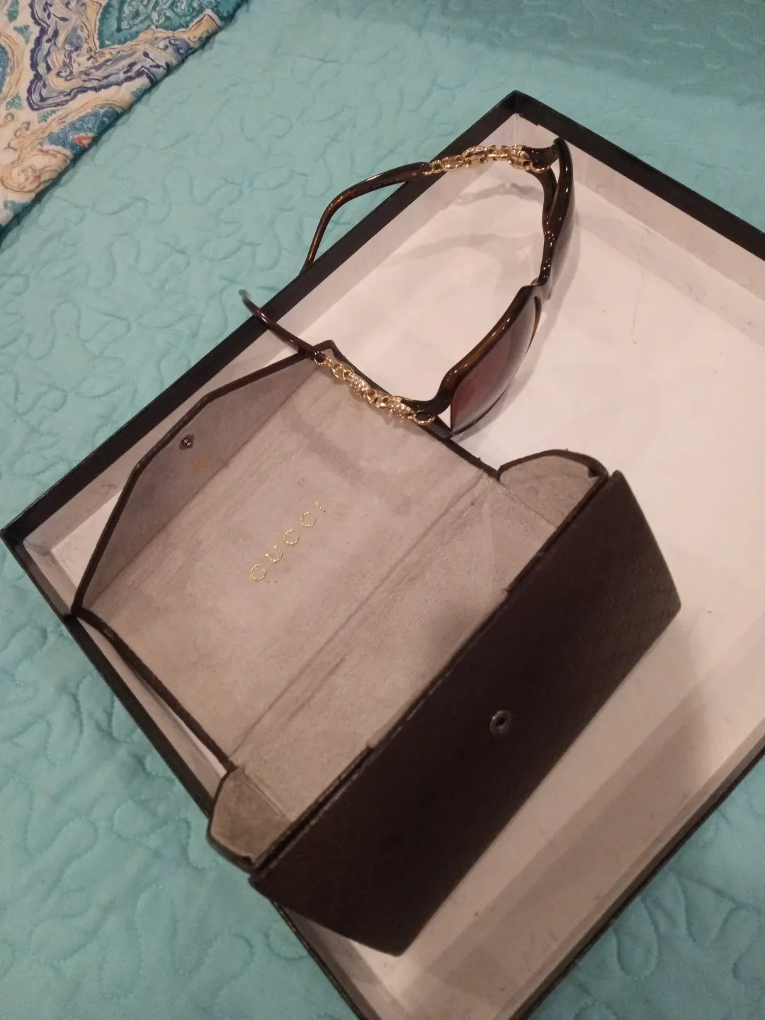 Gucci sunglasses with a brown frame and gold chain detailing on the arms. Comes with its original case and box. Lens color is brown.