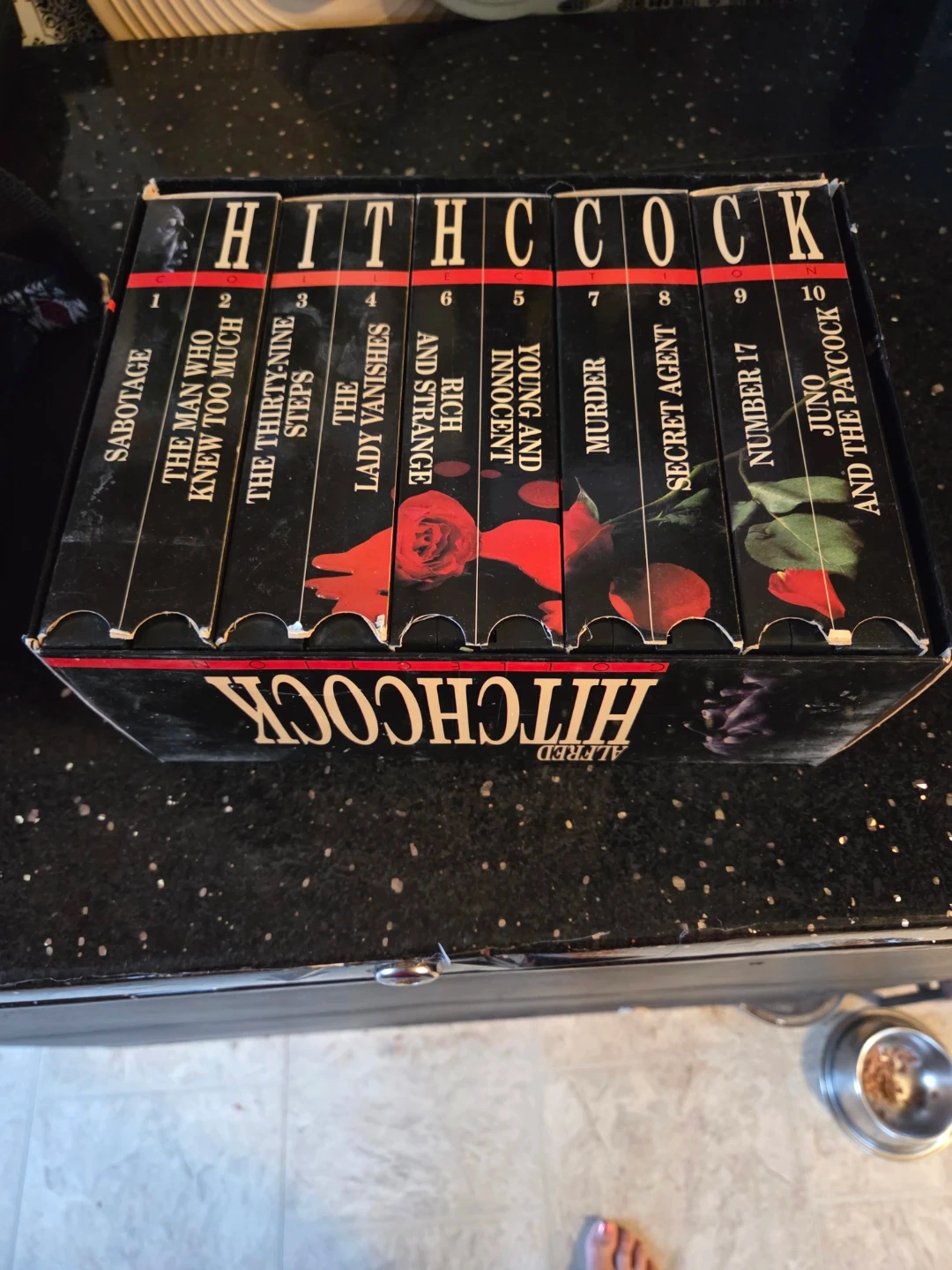This collection features 10 Alfred Hitchcock VHS tapes. Titles include Sabotage, The Man Who Knew Too Much, and The Thirty-Nine Steps. These tapes are great for classic film enthusiasts.