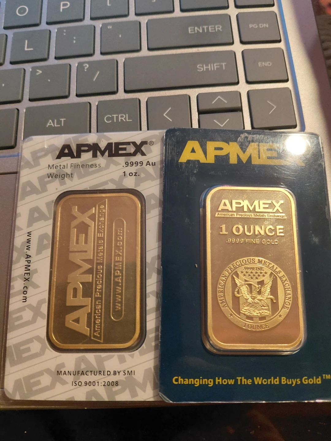 Two APMEX 1 oz .9999 fine gold bars. Each bar is individually sealed in protective packaging. One is in its original assay card, and the other is sealed in blister pack. These are stamped with the APMEX logo and hallmark.