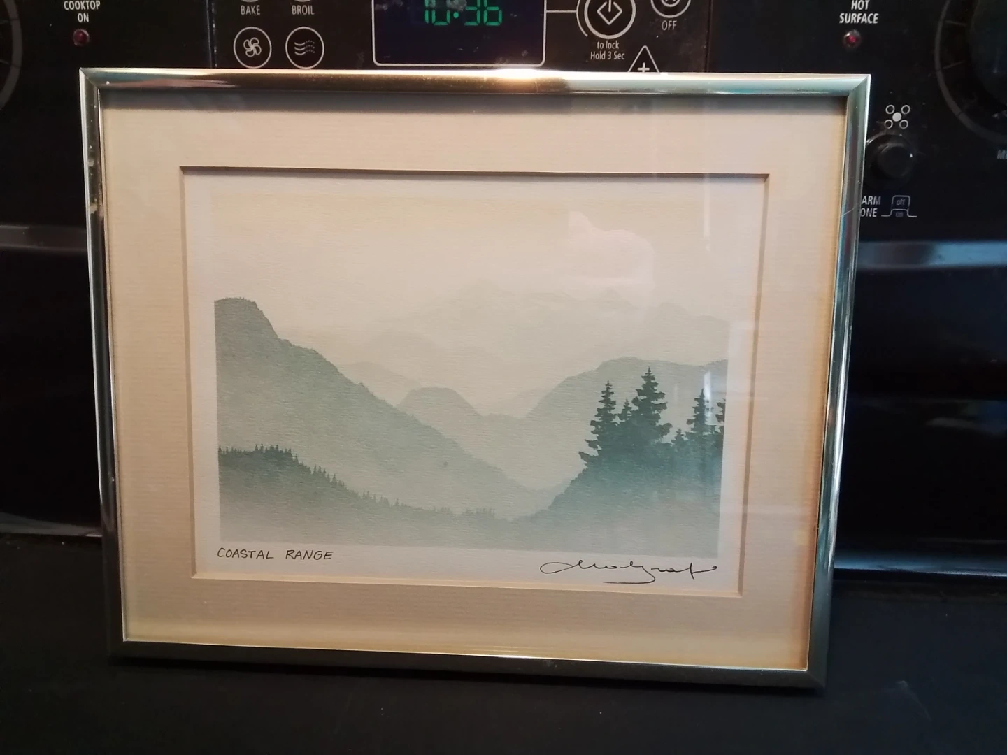 This is a Coastal Range artwork piece, measuring 10.25" x 8.25". It features a beautiful mountain scene and is signed by the artist. The artwork is in good condition, perfect for adding a touch of nature to your home or office decor.