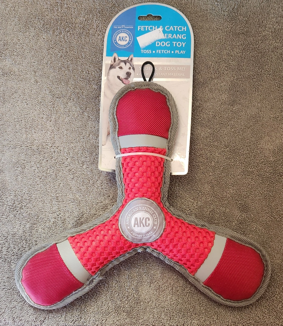 Selling a brand new AKC Fetch & Catch Boomerang Dog Toy! It's designed for tossing, fetching, and playing. The material is chew-8resistant, so it's durable for your furry friend!