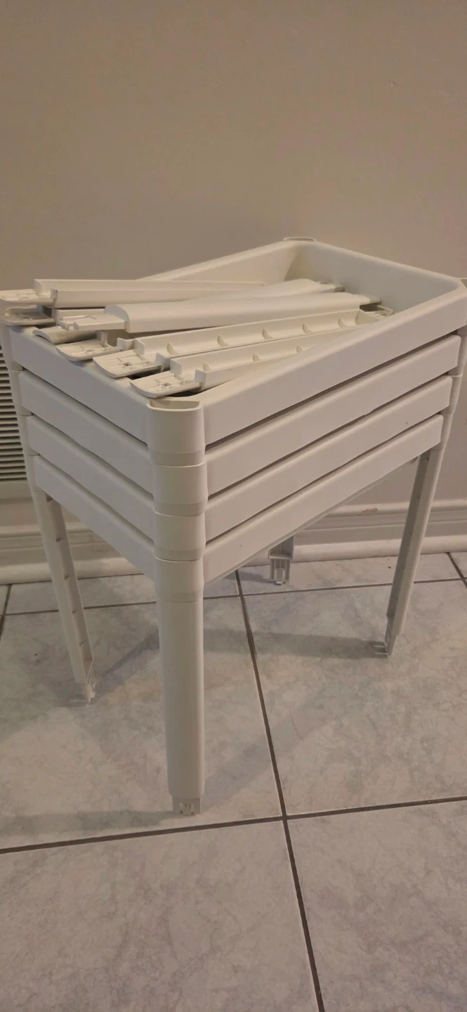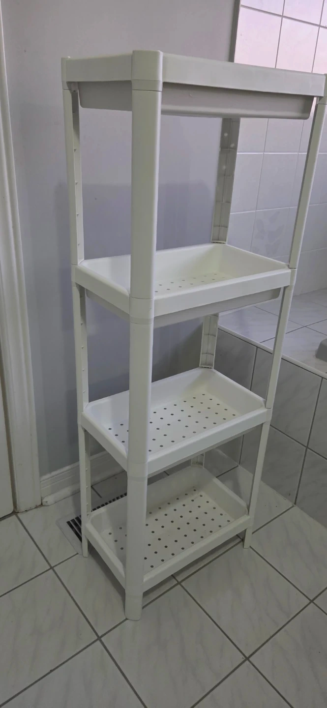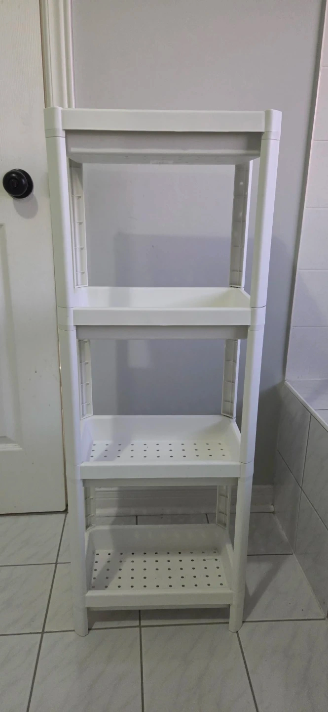This is a white 4-tier plastic shelf unit. It's made of durable plastic and features perforated shelves. This unit is perfect for organizing items in a bathroom or laundry room.