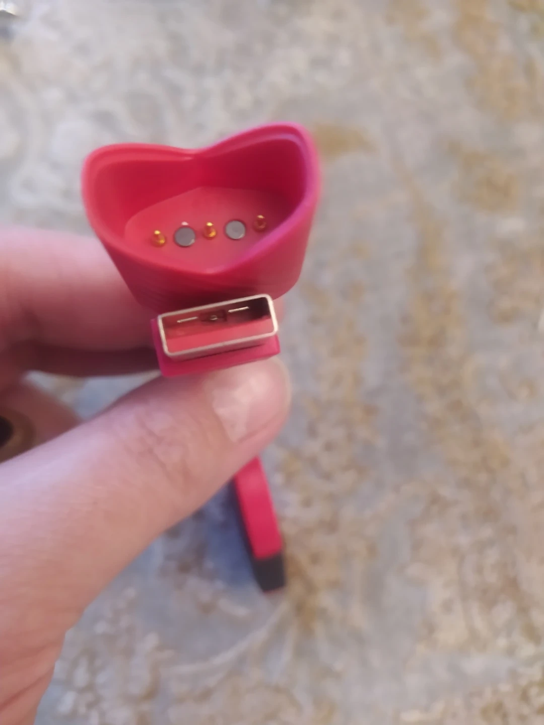 This is a pink replacement charger for the Fitbit Luxe. It features a USB connector for power. It's designed to connect directly to your device for charging.