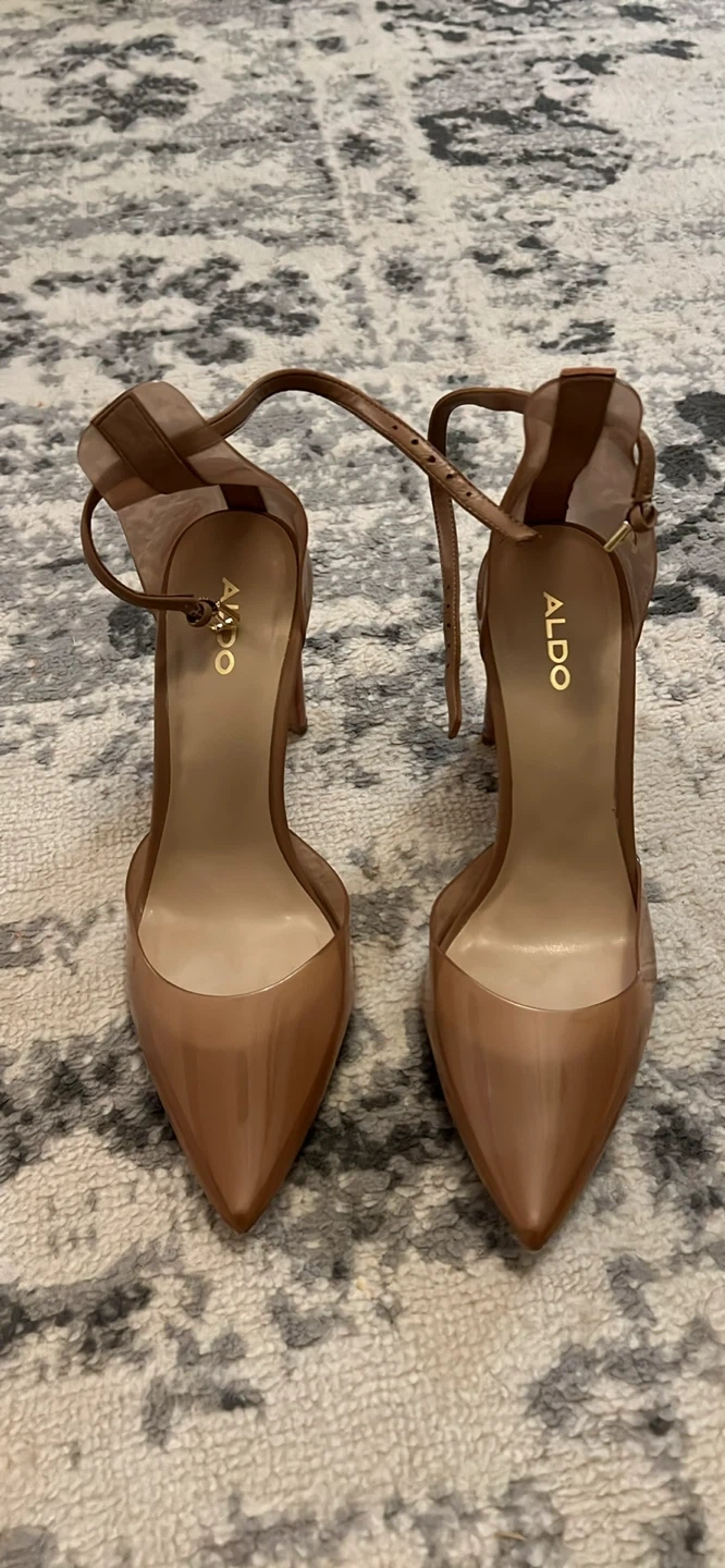 5Selling a pair of ALDO heels in US size 7. They're a stylish tan color with a clear accent. Perfect for dressing up any outfit!