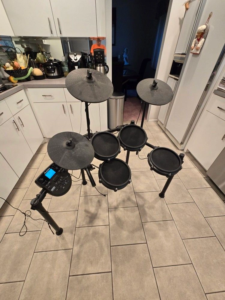 Guitar Trades Considered Electric drum set with rubber pads and an Alesis Nitro Drum Module Number Of Pieces: 7 Color: Black Brand: Alesis Skill Level: Intermediate