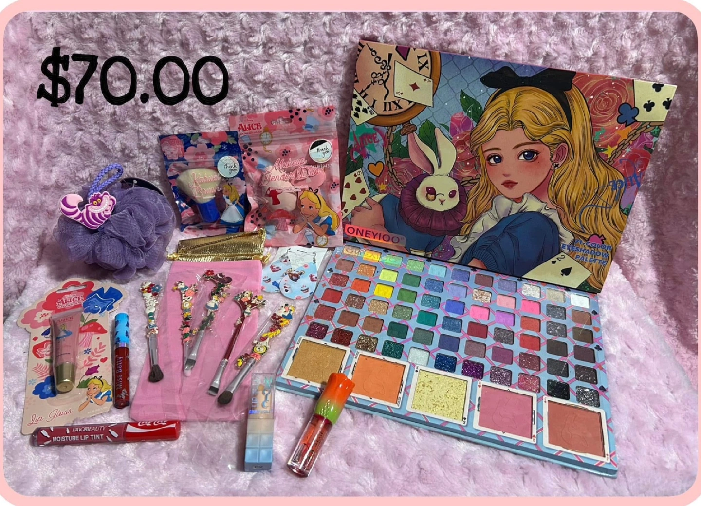 Large Alice in Wonderland themed makeup bundle. Includes eyeshadow palette, lip gloss, lip tint, makeup brushes, sponges, and more. All new.