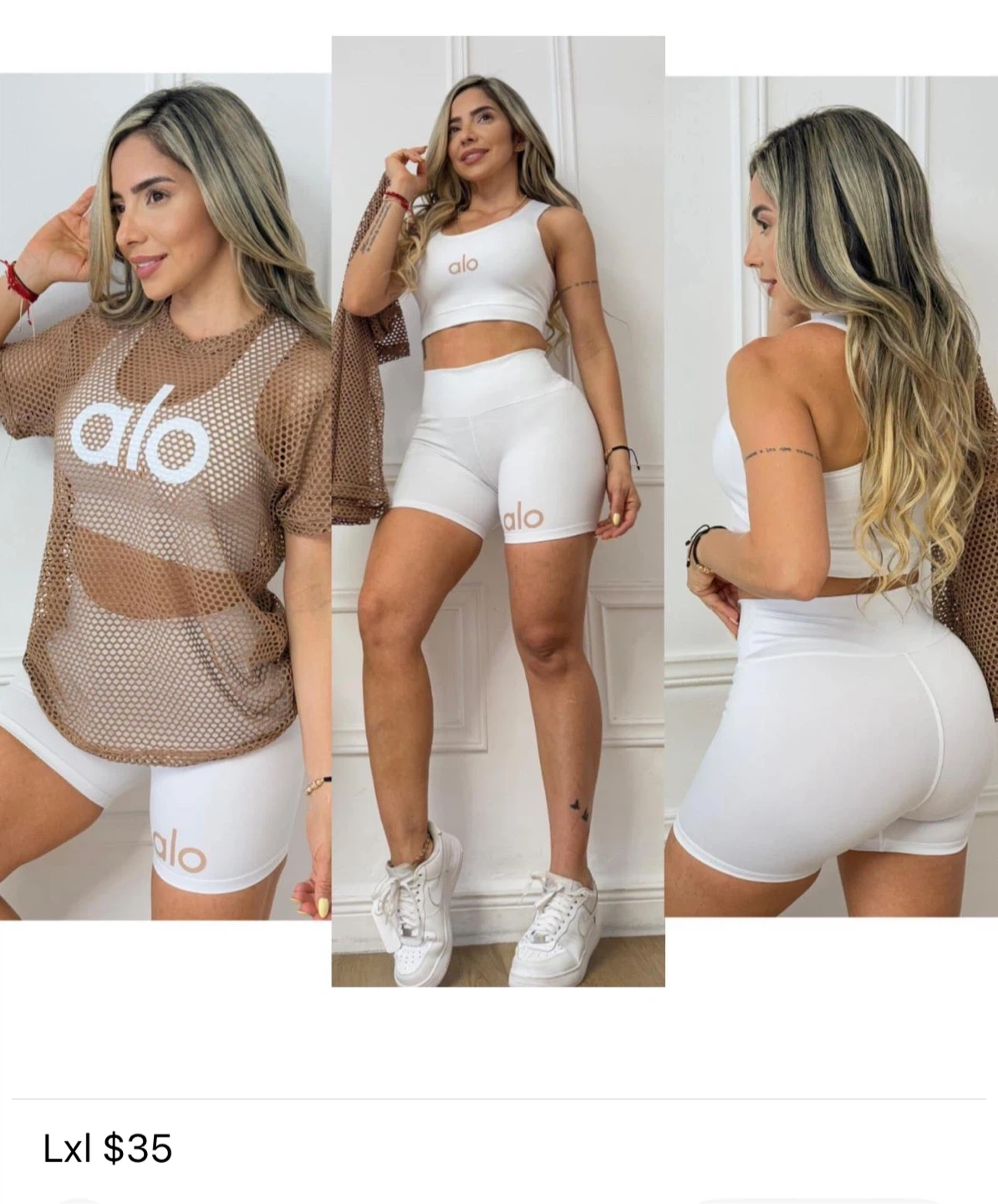 Alo activewear set in size L/XL! This set includes a sports bra, shorts, and a mesh top, perfect for workouts or athleisure wear. The original price was $35. The brand logo is displayed on the front of the items