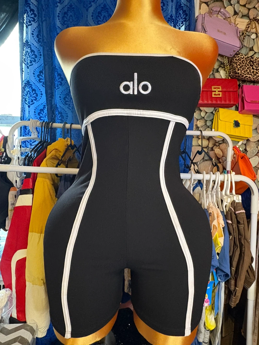 131Selling a stylish black jumpsuit from ALO Yoga! It features a tube top design with white accents. Perfect for workouts or casual wear