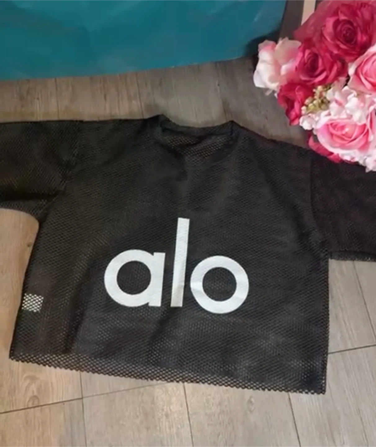 Selling a black mesh cropped top from Alo Yoga! It's in great condition and perfect for workouts or casual wear. The mesh material is breathable and comfortable.