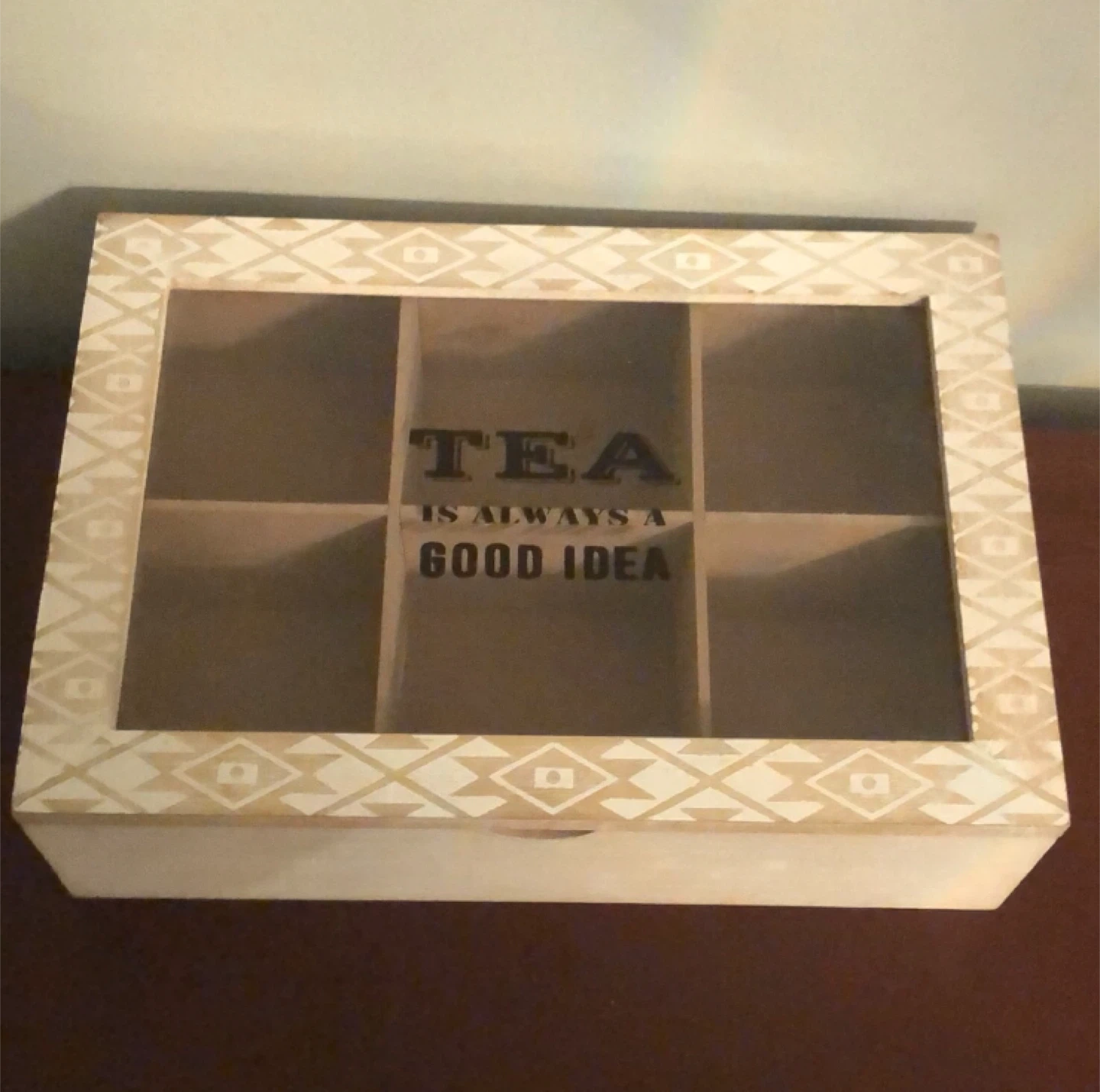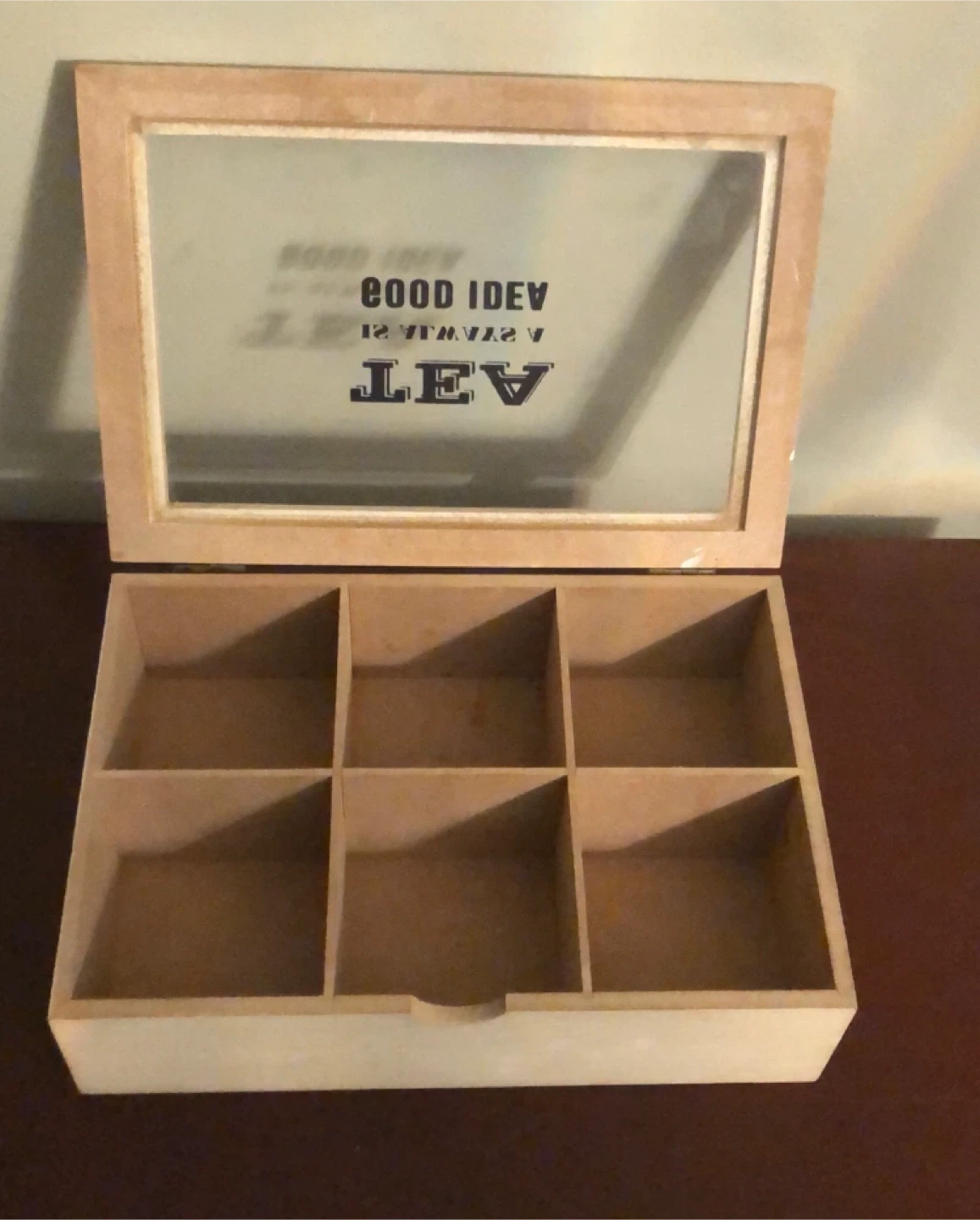 Wooden organizer box with a hinged glass lid. It has six individual compartments inside. Perfect for storing tea bags or small craft supplies.