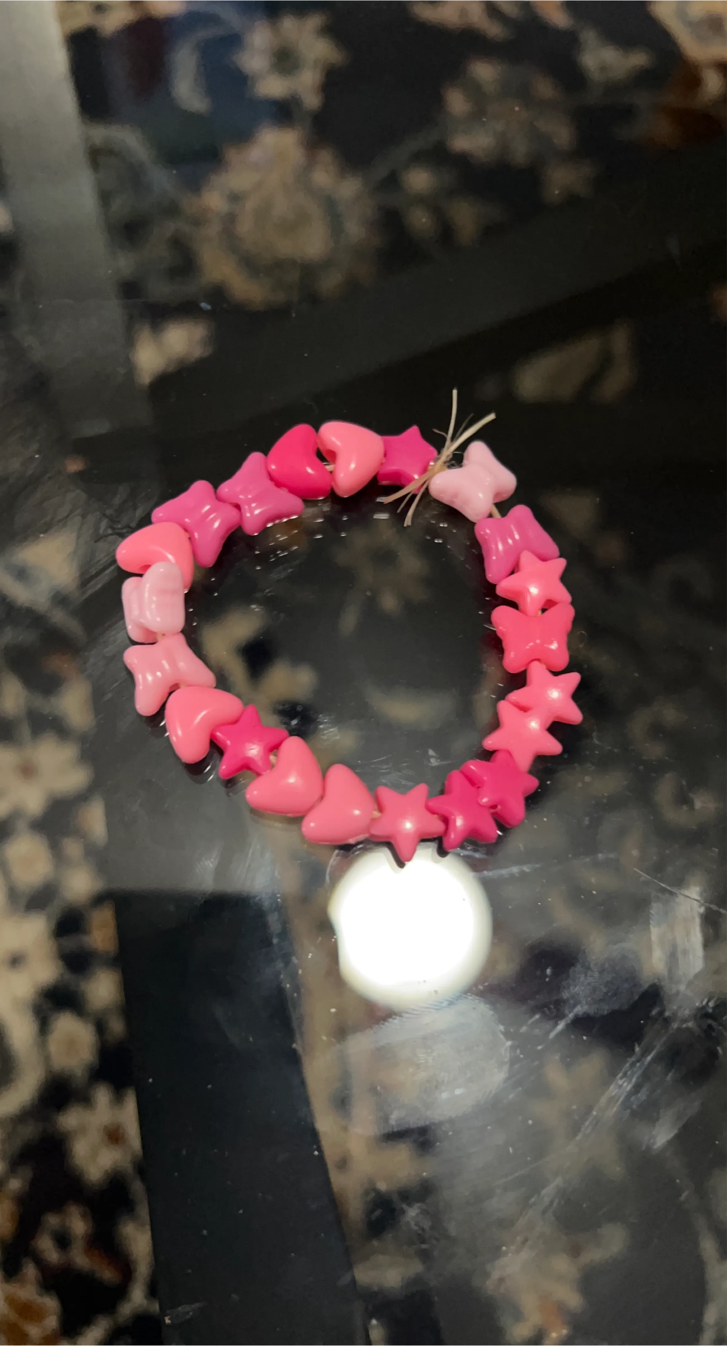 This is a cute bracelet made with pink beads shaped like stars and hearts. It's strung together with a simple tie closure. Perfect for adding a little splash of color!