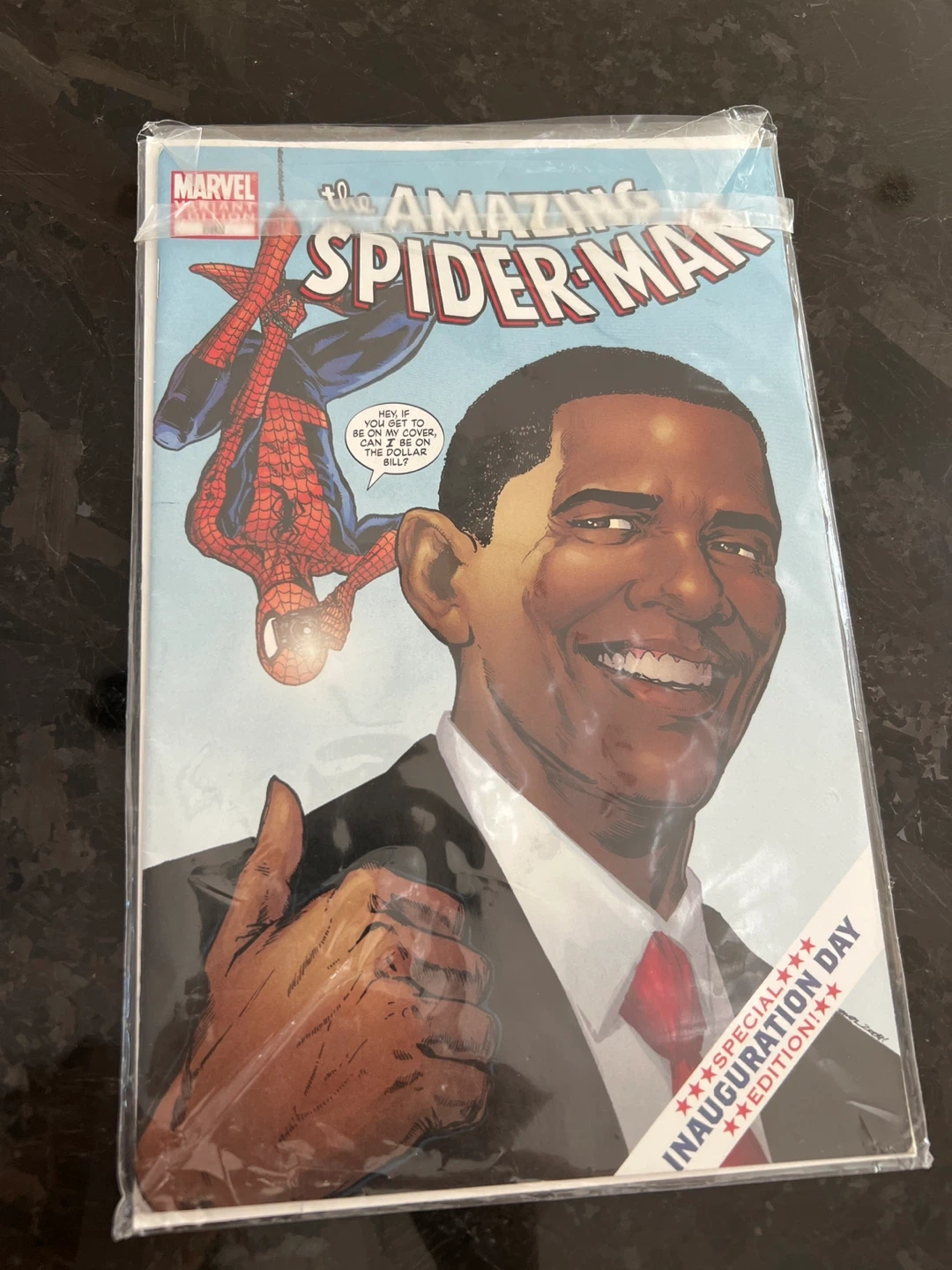 Selling a copy of The Amazing Spider-Man Inauguration Day Edition comic book. It features Spider-Man and Barack Obama. Great for collectors!