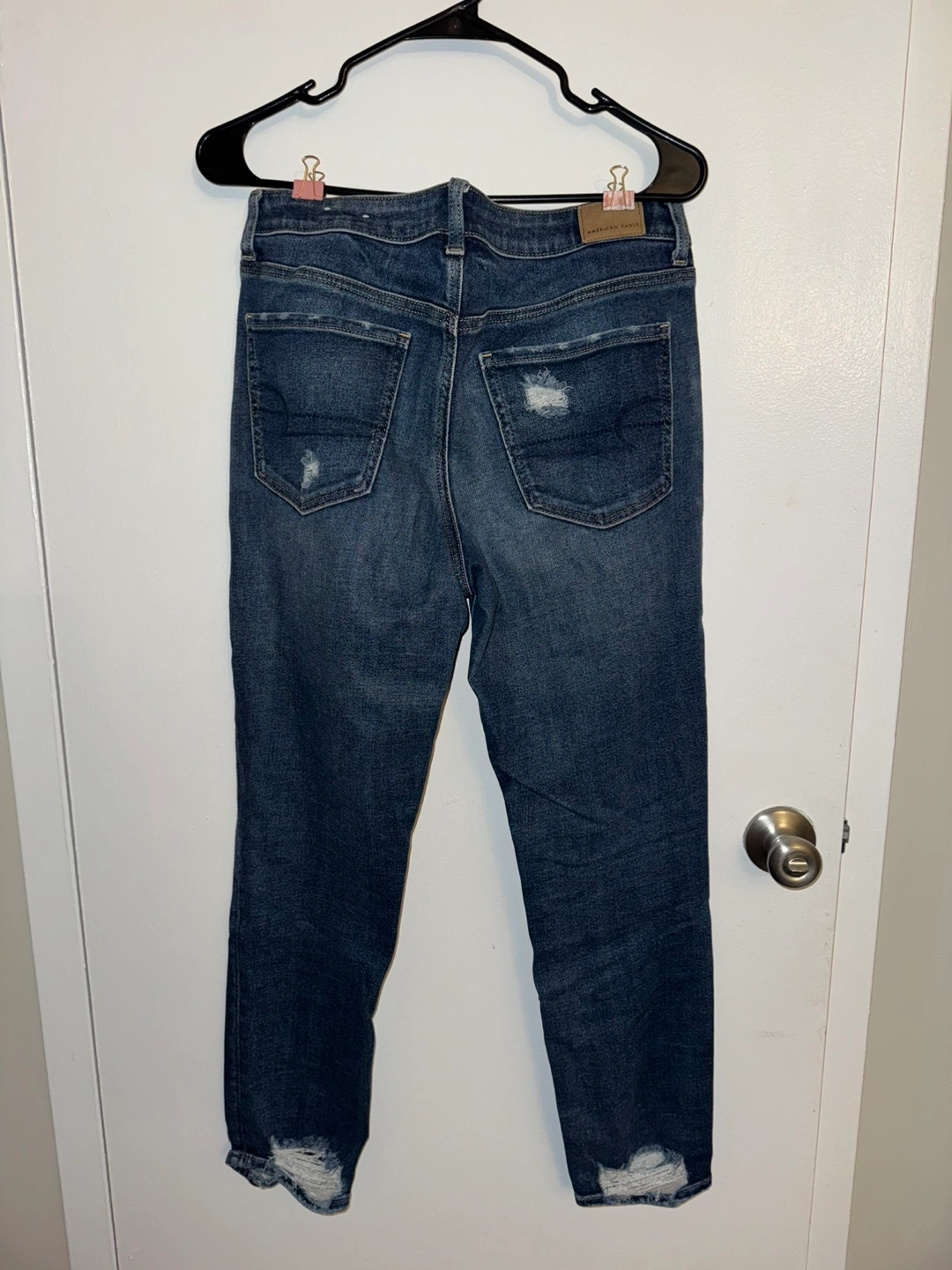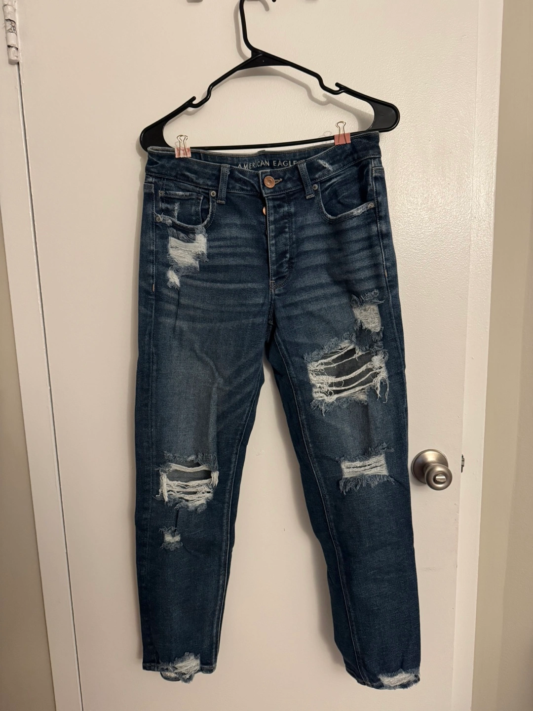 Selling a pair of American Eagle jeans in good condition! They are a size 6 and have a stylish ripped design. The Denim design is called “Tomgirl”
